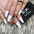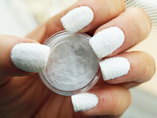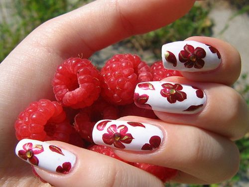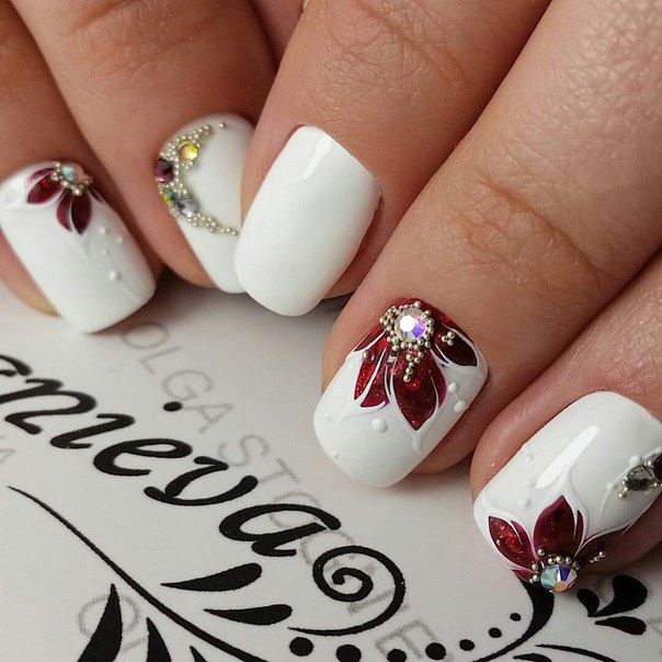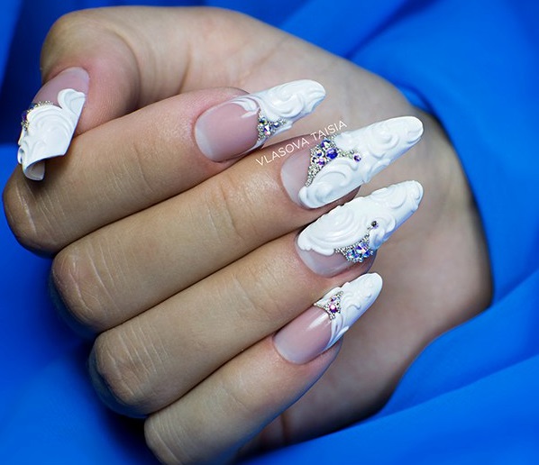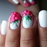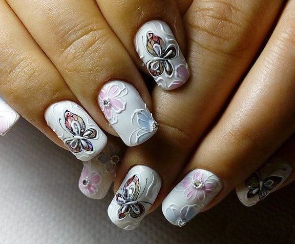 Sometimes a white nail plate is decorated with soft sand and a matte top. It turns out a magnificent velvet design with amazing flowers. Manicure with three-dimensional image made by gel-paste, make in special cases.