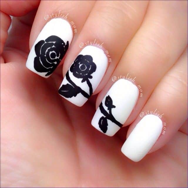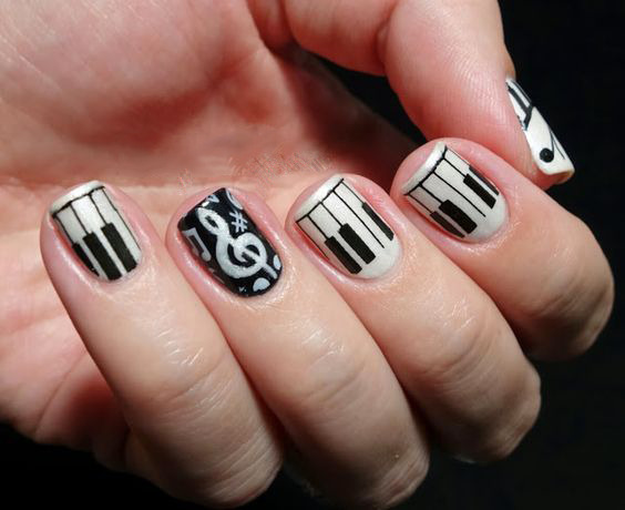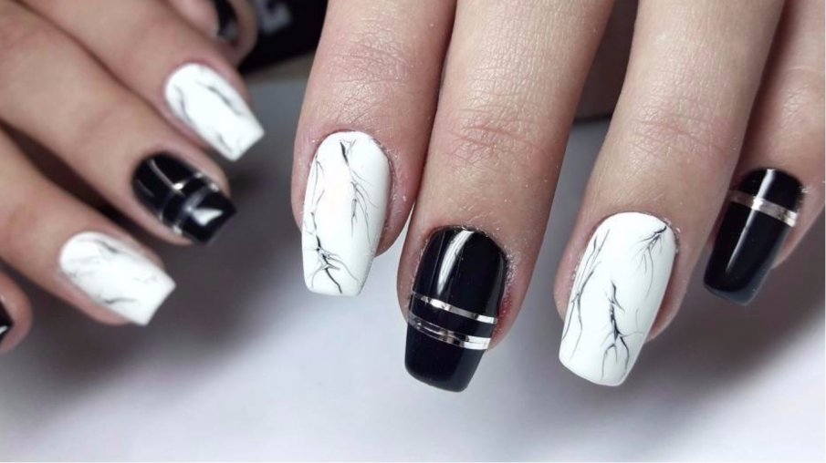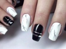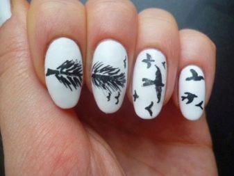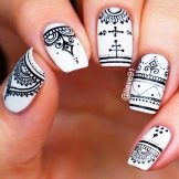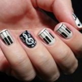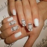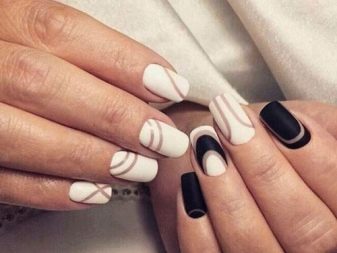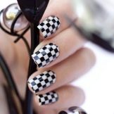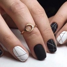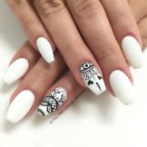 Black and white color combination is considered a classic. On the white basis of the nail depict a chessboard, longitudinal and transverse stripes, characters, ornaments, geometric figures, zigzag patterns. Often on a white background depict little black cats and dogs. For reproduction of thin lines, streaks and points use a thin brush or a needle.