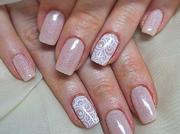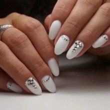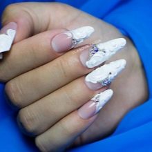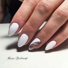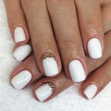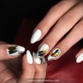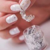 White design looks elegant with shimmering powder, crystal chips, acrylic sand and other decorative elements. Craquelure created using a special white lacquer with the effect of cracks of the paint layer. Caressing your eyes with a gradient manicure. Marbled nails are also very popular. On a white background with a thin brush make the stains, imitating the texture of the stone.