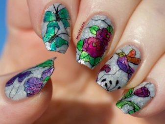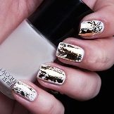 Frosted image with foil in the casting technique is also attractive and unusual. This technique uses a special foil, pre-dried in the lamp. First, the surface is treated with gel varnish, then put an ornament saturated gel paint. The defatted foil is applied by the matt side gradually, to avoid bald spots. Then the picture is covered with two final layers of clear varnish.