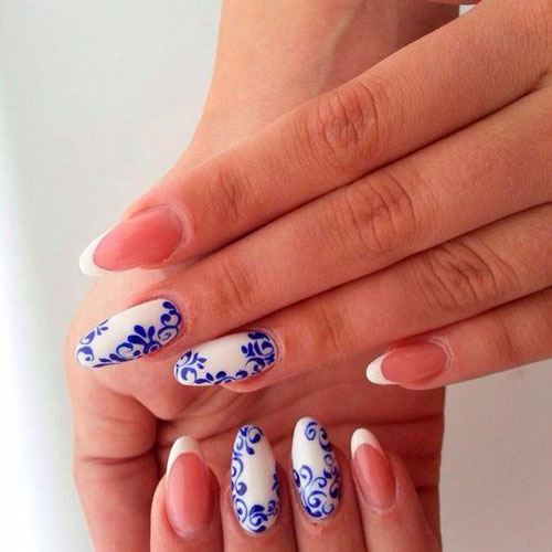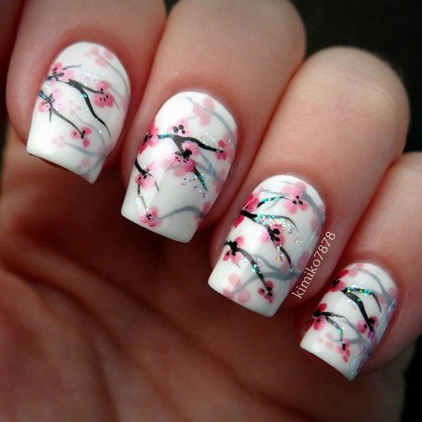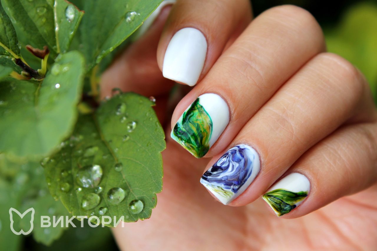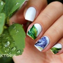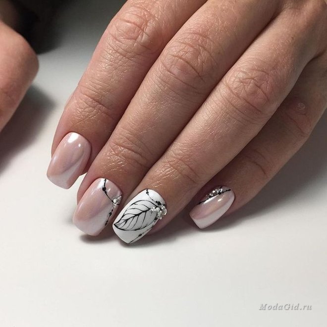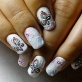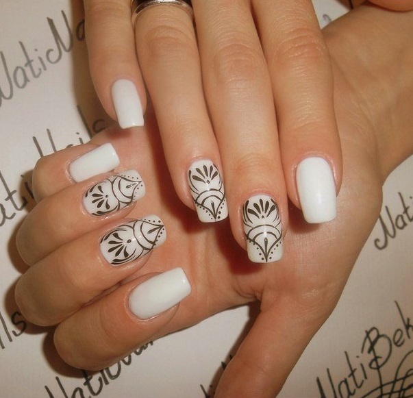 Any decorative element applied to the nail plate, gives elegance and solemnity. Various patterns, flowers, symbols look great on a white background. This season is fashionable to use floral design. Gentle petals, branches, greens draw a thin brush using a palette for mixing colors.