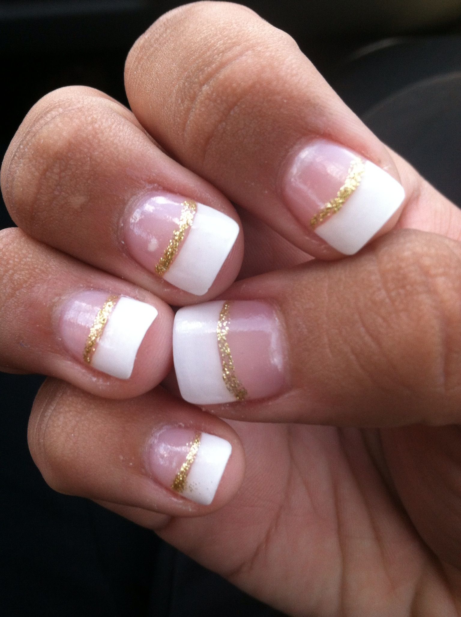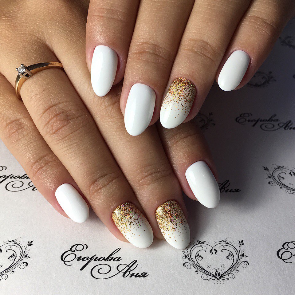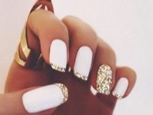 Attractive combination of white nail base with a golden tone. Recognized as the classic version of the lunar manicure with gold splashes on a white background has a lot of varieties. The radical hole is white and the nail plate is of a different color. The white surface may have a transparent or colored basal hole.