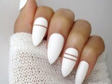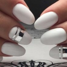 Unusual look on the white nails, silver and gold stripes, which can be applied with a special metallized adhesive tape. Black stripes on a white nail surface make a strong impression on others. They can be positioned longitudinally and transversely. Original look on the nail strips of zebra. Longitudinal lines are often laid with rhinestones.