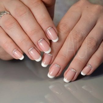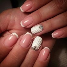 White jacket neatly and elegantly looks on the nails of any length. White thin edging is applied to the tip of the nail, covered with a transparent, cream or pale pink varnish. French is perfectly combined with various patterns, rhinestones, sparkles. On short nails, a white jacket looks great in combination with drawings and sliders. Especially beautiful is the diamond-shaped ornament, which visually lengthens the nail.