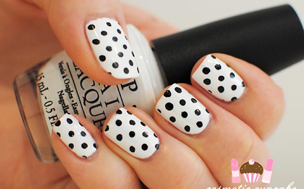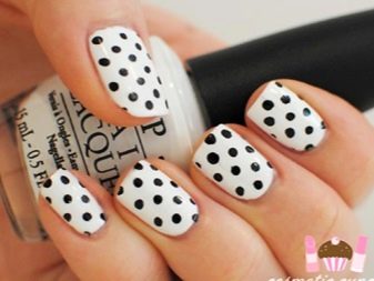 It is very fashionable to combine white tone with any dark lacquer color to create a contrast. Black peas of different sizes on a white background - the last squeak of fashion. All nails are covered in white and two in black or red. The unusually bold combination with the red coloring looks enchanting and slightly bold.