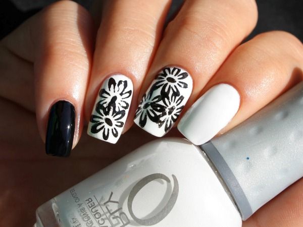Fashionable, bright, beautiful, volumetric flowers can be created independently at home. First, the nail surface is covered with white gel polish, then the contour of the flower is drawn with black gel. A mixture of colored paint with acrylic sand draws petals. In conclusion, the picture is fixed top.
