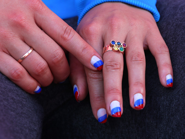Often used thematic design. In winter, nails depict snowflakes, snowmen; in the spring - mimosa, snowdrops, lilies of the valley; in the summer - butterflies, ladybirds, chamomiles, poppies; Autumn - yellow and red leaves. For the winter theme, calm tones are well suited, spring colors — delicate shades, summer and autumn — bright: turquoise, blue, green, red, pink and yellow. There is also a newspaper manicure.