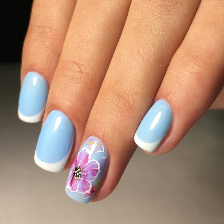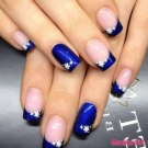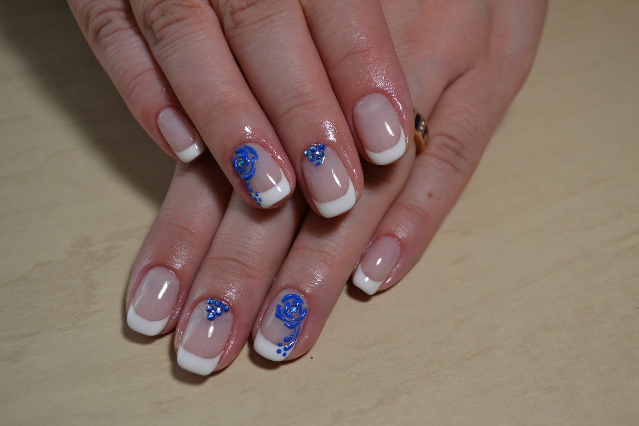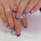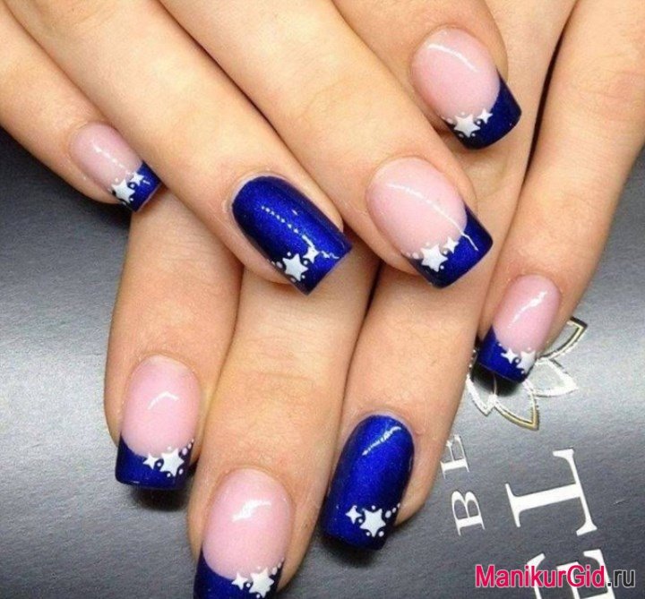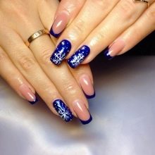 Classic French manicure is always relevant, and if it is made in blue, this adds even more expressiveness to the design. You can perform a manicure using a 3D gel or acrylic. First, the master imposes a standard jacket in blue, then the nails are covered with camouflage material, and from the top, a three-dimensional drawing is performed in white.