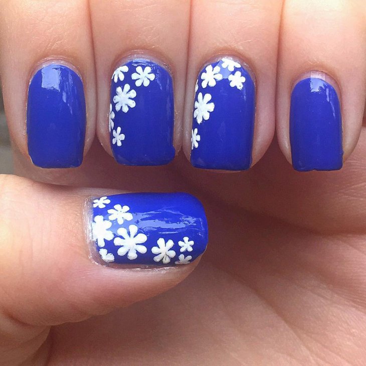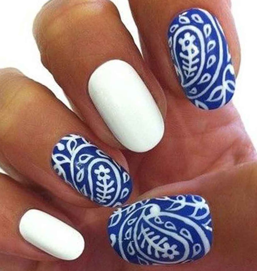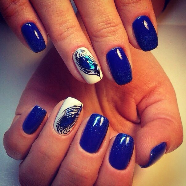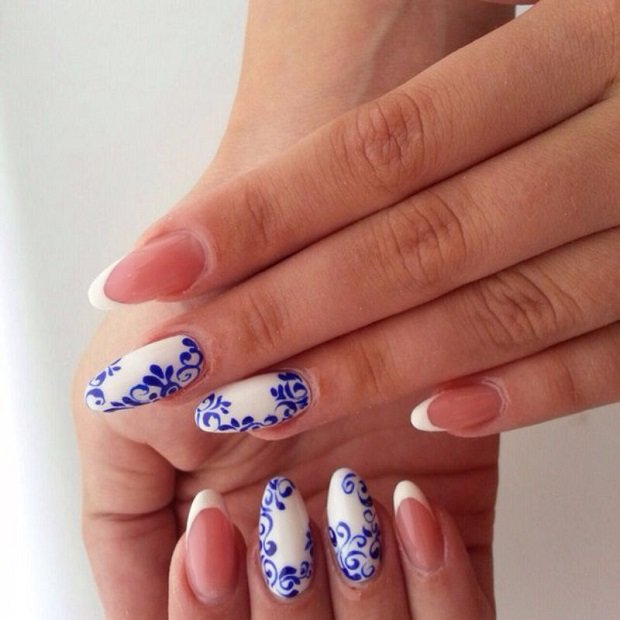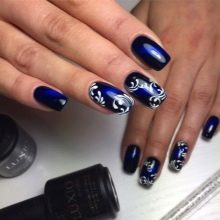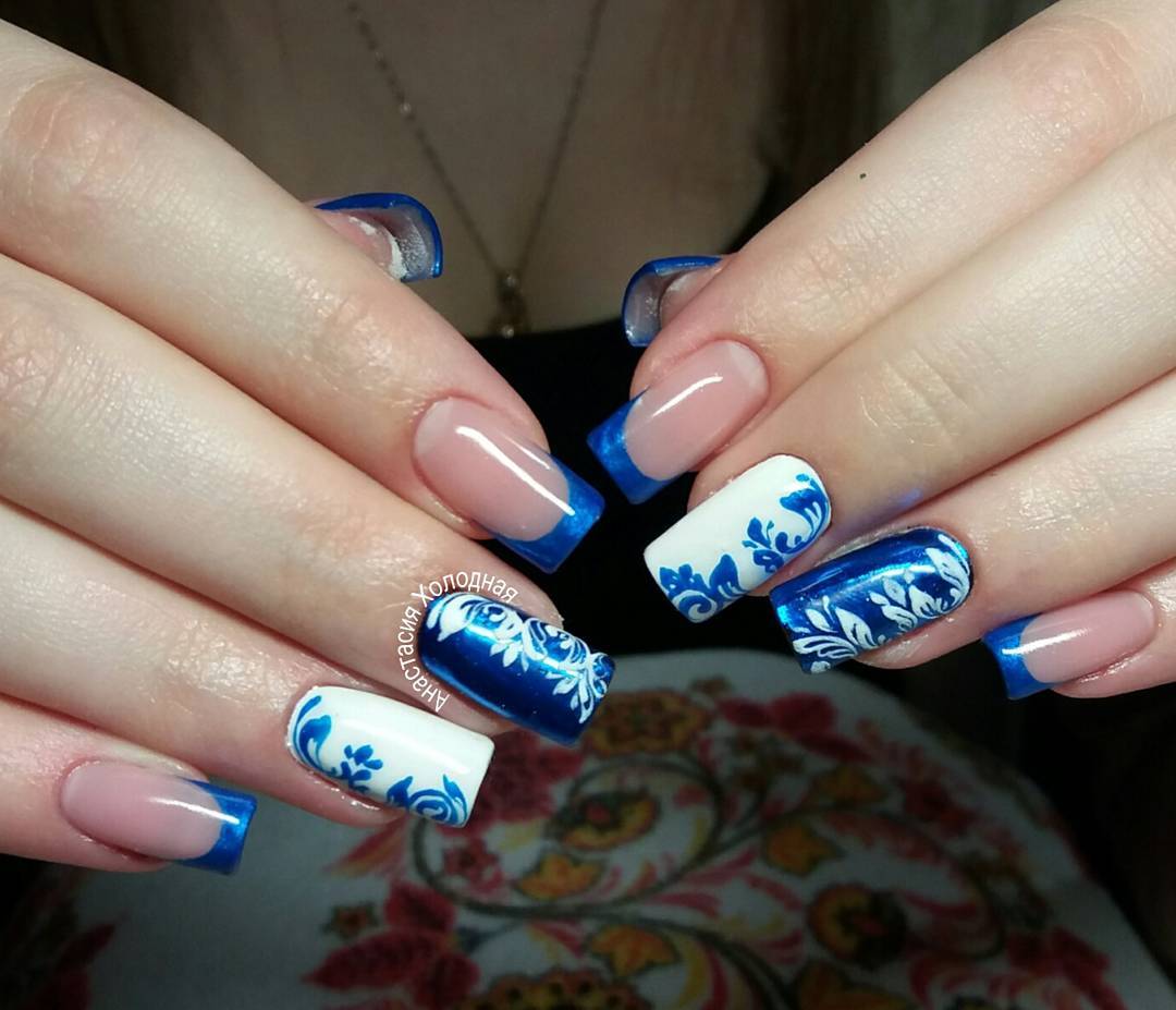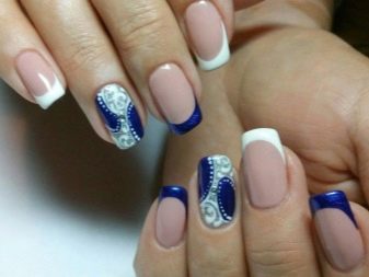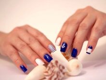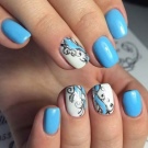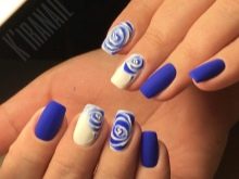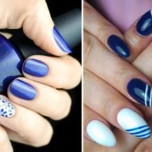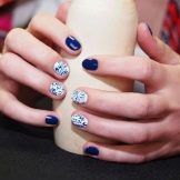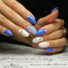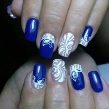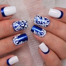 Blue and white are so contrasting, and at the same time they are so combined that they allow you to perform a variety of drawings on any subject on the nail plate. If a woman goes to sea, then you can "put" on the nail a white sail on a blue background. A very unusual variant is painting under Gzhel, but in this case it is better to use only two nails, for example, on the ring and middle finger, and paint the rest in a dark blue shade. White roses or other patterns on a blue background will look very tender and feminine.