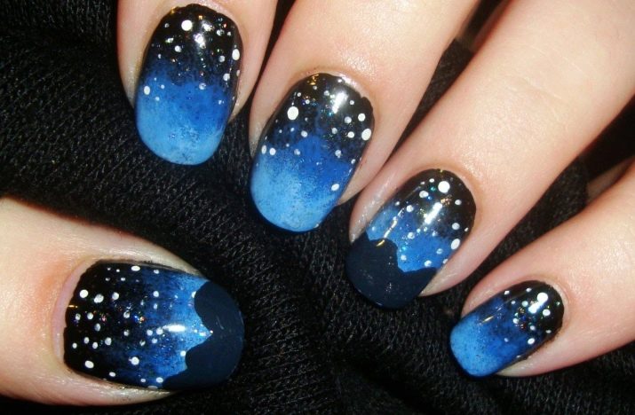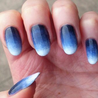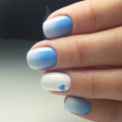 Gradient manicure in blue-white color looks very elegant and artfully. If you use a blue tint, the nails will look very tender and spring-like. This manicure is suitable as a daily, as well as for trips to rest. If you apply ultramarine or purple hues, it will be a design for a gala evening.
