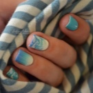 - we cover the nails on the thumb, index finger and little finger in a completely blue color; we apply the same shade on the middle nail, but with sparkles;