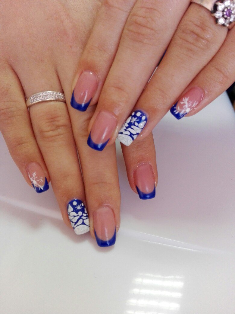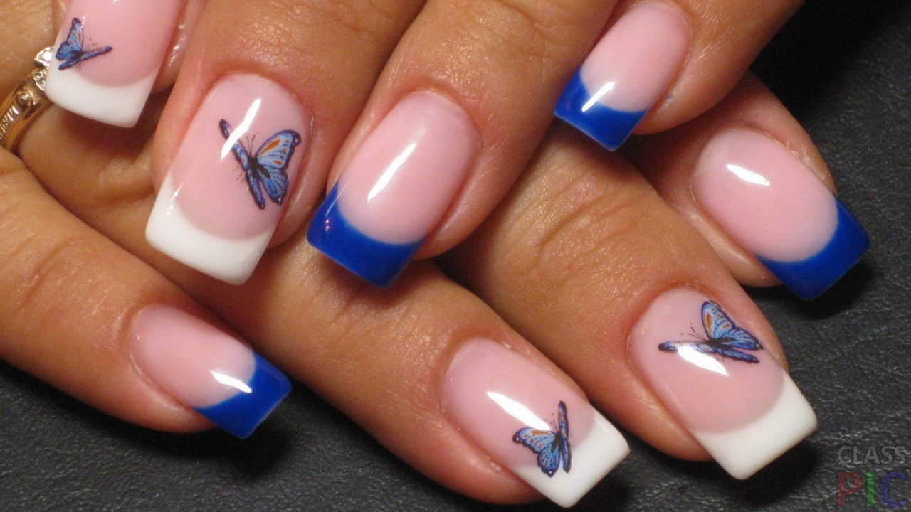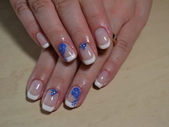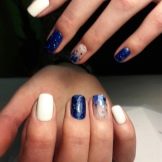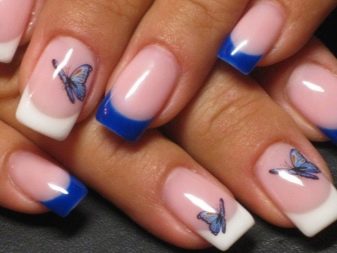 Blue and white shades can be used to create not only winter but also summer design. One example: on the nails on the little finger, on the ring finger and on the thumb, we put a blue jacket, on the other nails we perform white French manicure and draw blue butterflies.