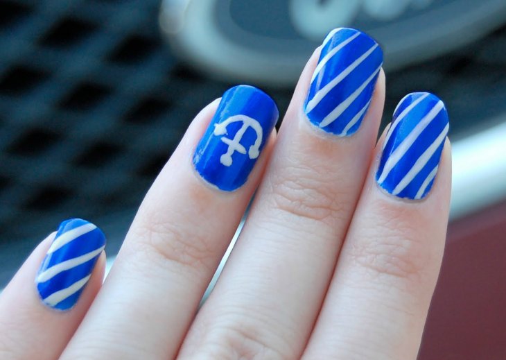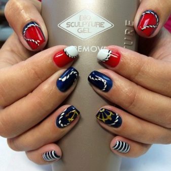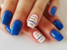 It looks very impressive marine manicure, which is an alternation of white stripes and lines the color of sea wave. Interspersing a red hue will look even more bright and unusual. For example, one of the bands can be made red or draw a purple anchor or a shell, covering the top with gold leaf. Looks nice and red heart on a blue and white background.