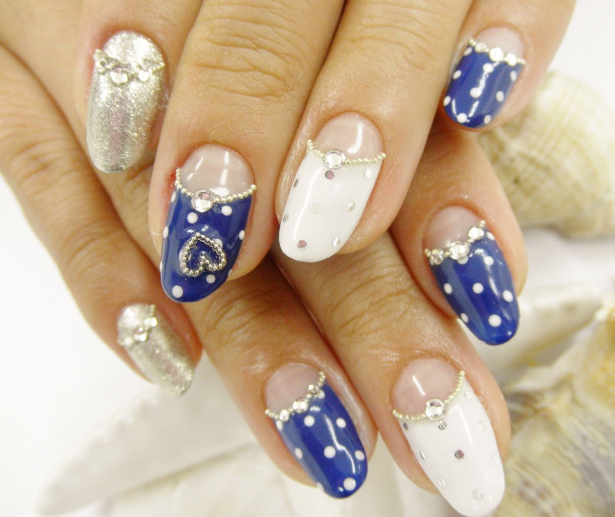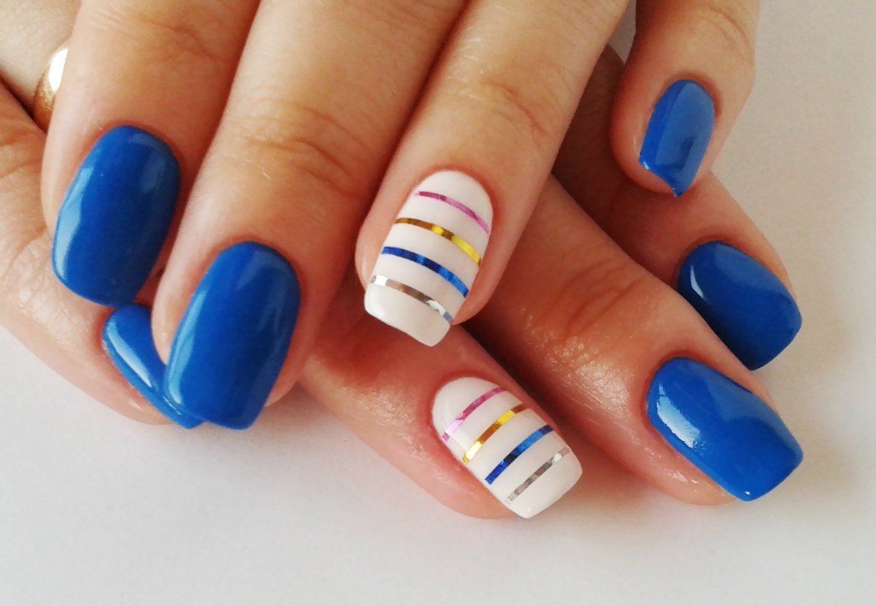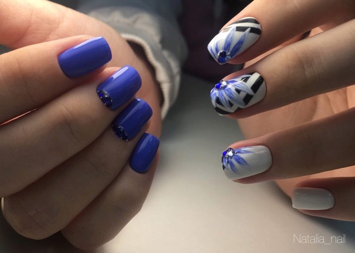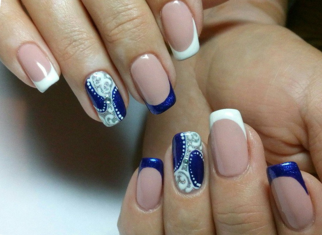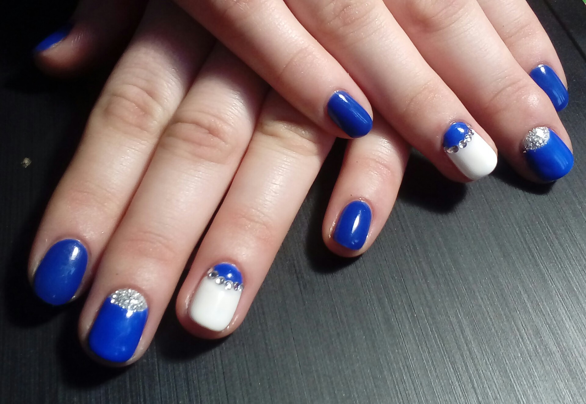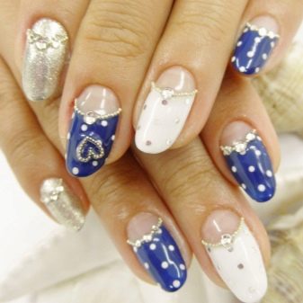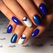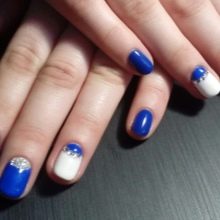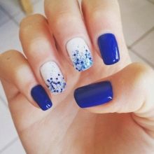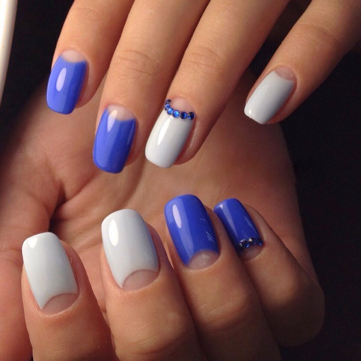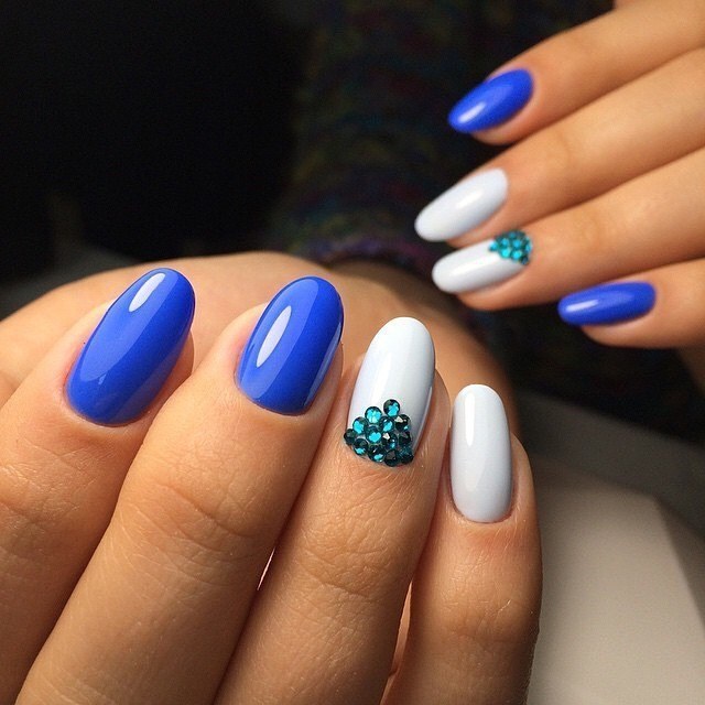 The combination of blue and white can be used in the case of nails with sparkles and rhinestones. Popular and simple even for a beginner master option: