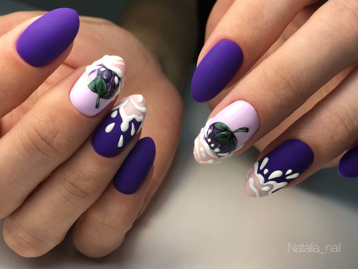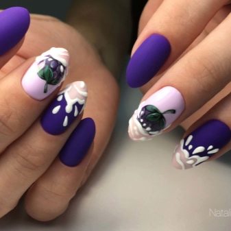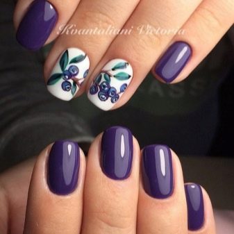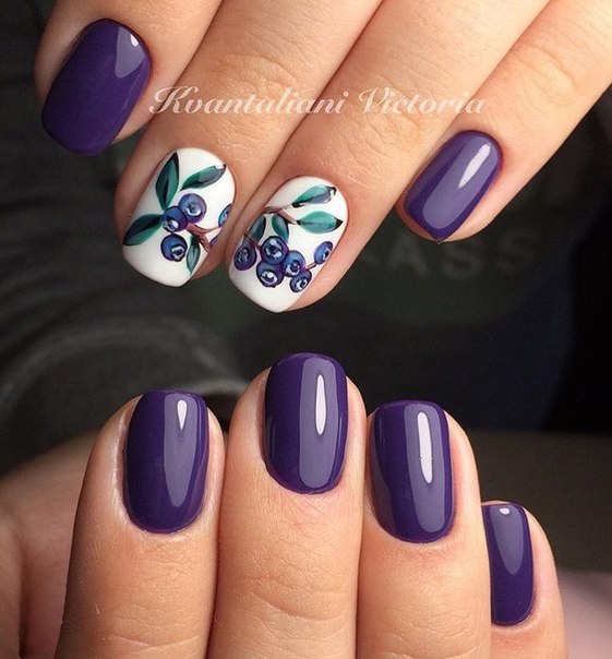 Another summer version - the image of blue berries on a white background. It is better to paint the berries on two nails, and cover the rest completely with the same varnish or color to match. Blackberry, grapes, blueberries, and blueberries are suitable as a picture. Will delight the eye and interspersed with green leaves in a handful of berries.