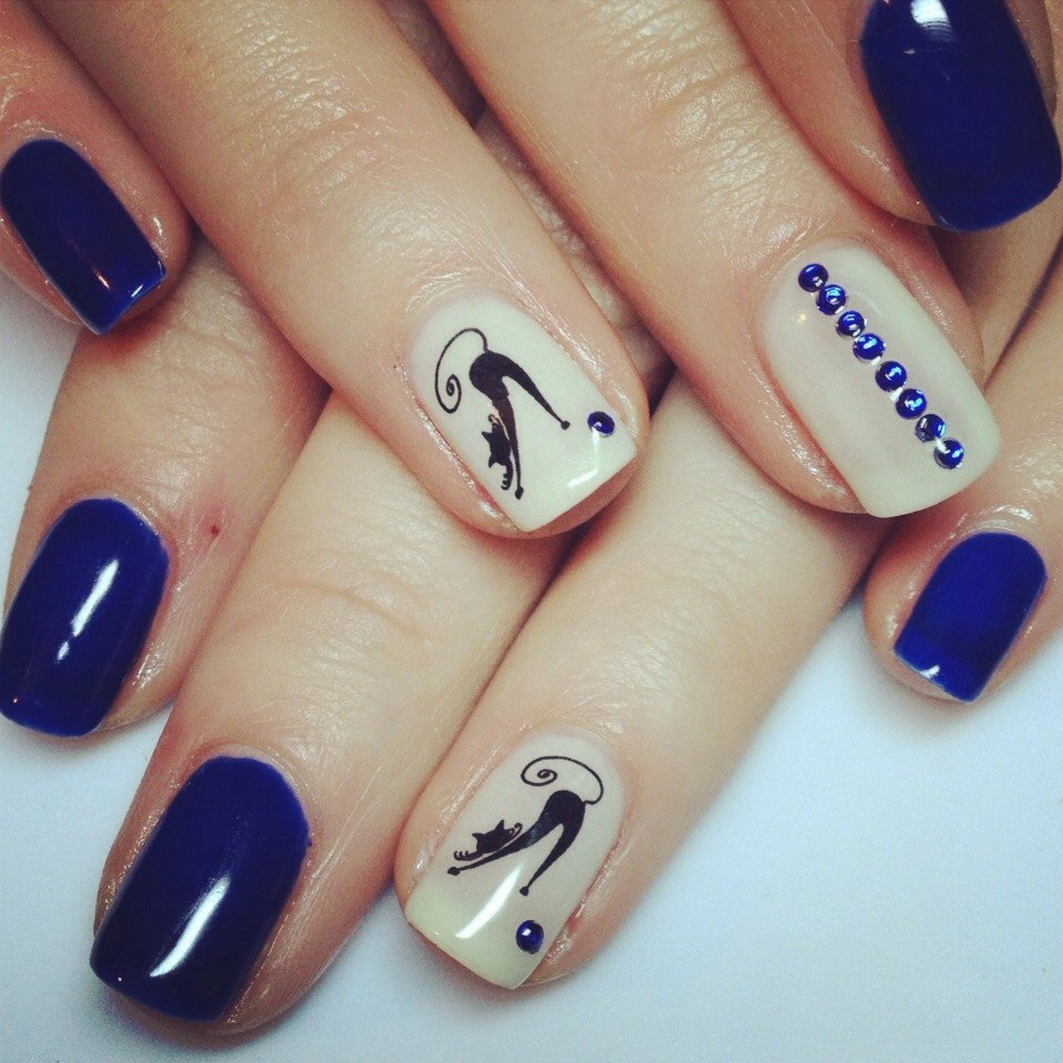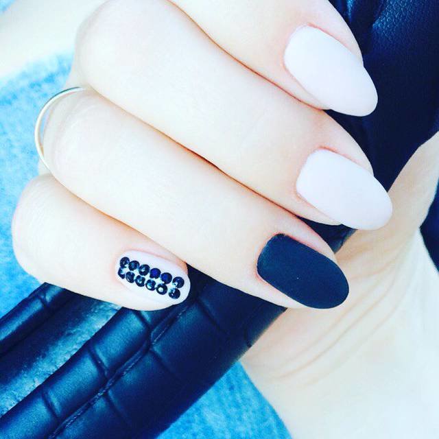 A dark, almost black matte manicure in the color of Prussian blue looks very beautiful and expensive. If you choose the right tone, you are no longer allowed to use any effects. Alternatively, you can paint one nail in a light beige color and apply on top of white and sapphire crystals of different sizes.