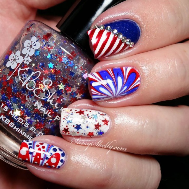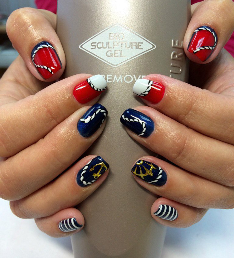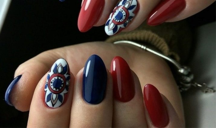 Blue-red-white nails with an abstract design look very impressive. You can apply your favorite colors in random order in small strokes.