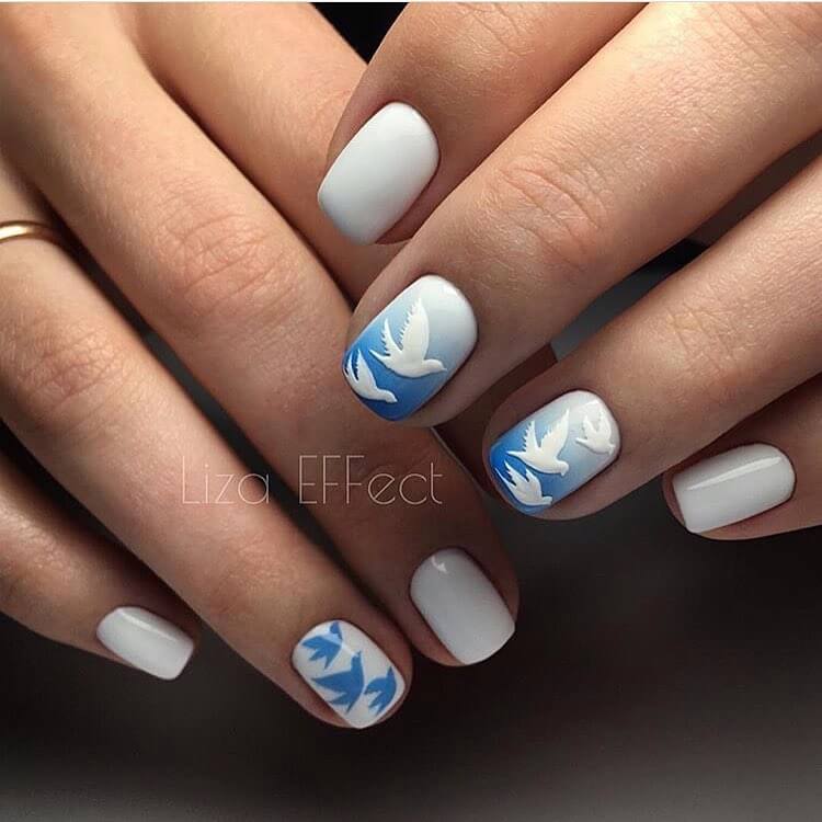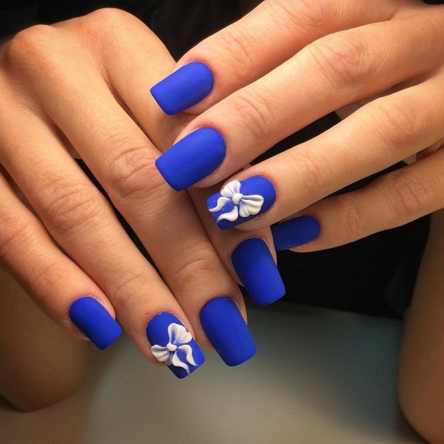 - The advantage of a blue-white manicure is its dull combination, which will be a great addition to a fashionable bow and will be remembered by others.