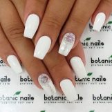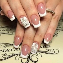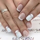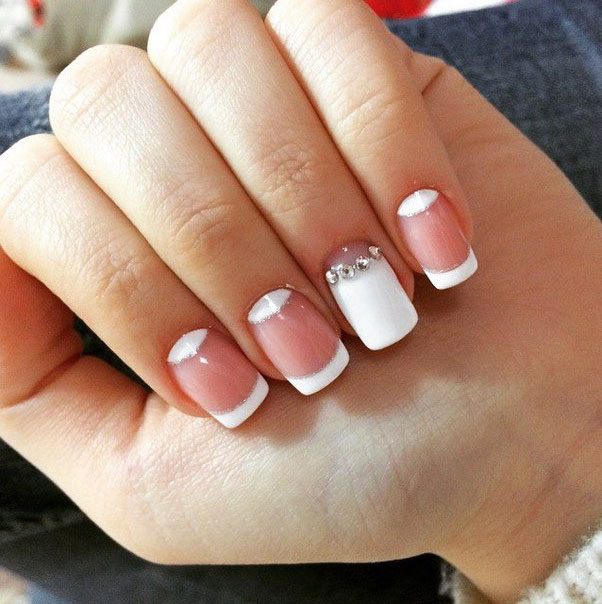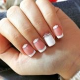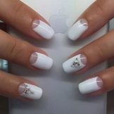 Short nails are not a reason to deny yourself rhinestones. White manicure looks good on any length. In order to create a truly luxurious look, use small stones. Choose a design that the decorations were a little, and they were present only on 1-2 nails. On long nails can be done not only everyday manicure with a small amount of jewelry. You can experiment with evening designs. To go to a party, you can decorate white nails with a large number of small stones or use several large ones.