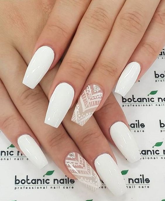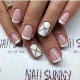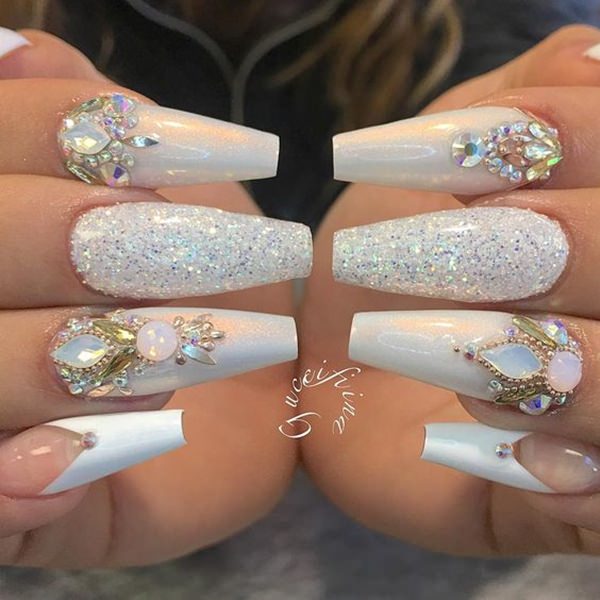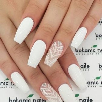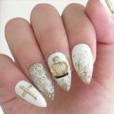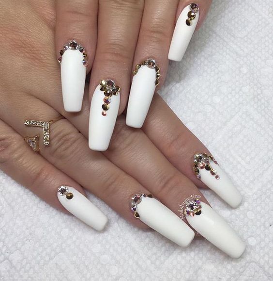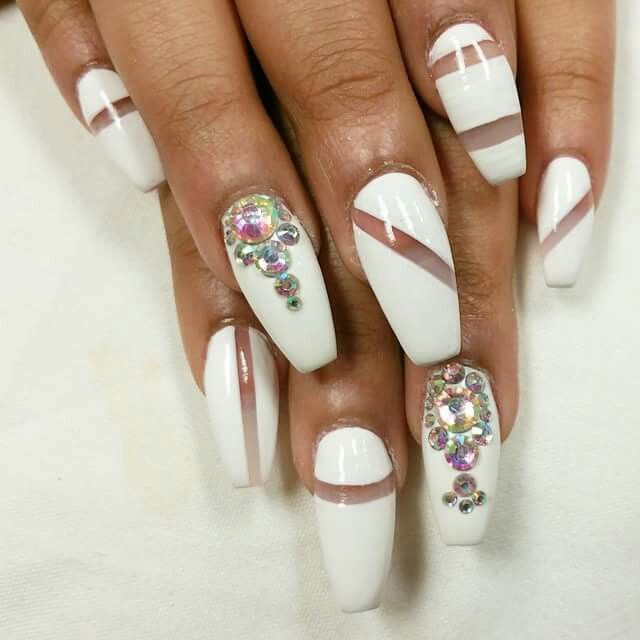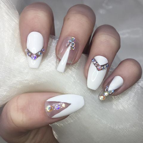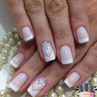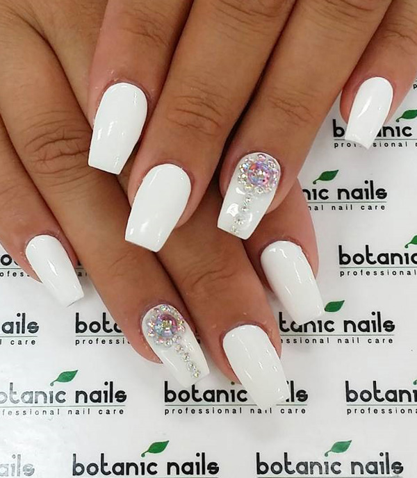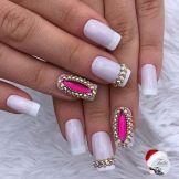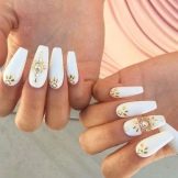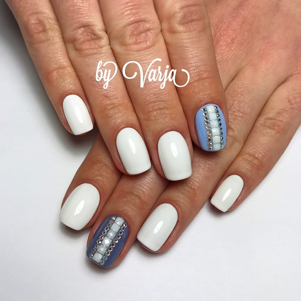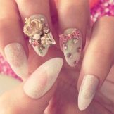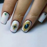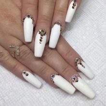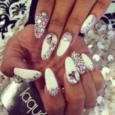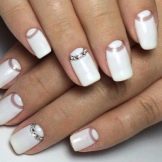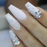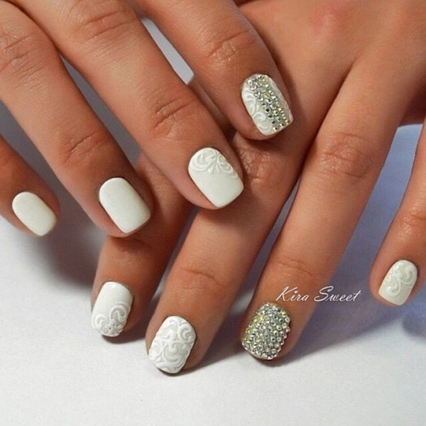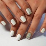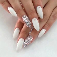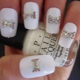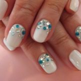 This design is well suited for square and oval nails of medium length. You can decorate white manicure with geometric shapes, lined with crystals of different colors. If you decide to fill the entire nail with rhinestones, then use decorations of small diameter.Remember that such a manicure is suitable for a party, but not for everyday life.