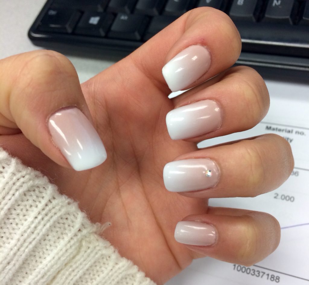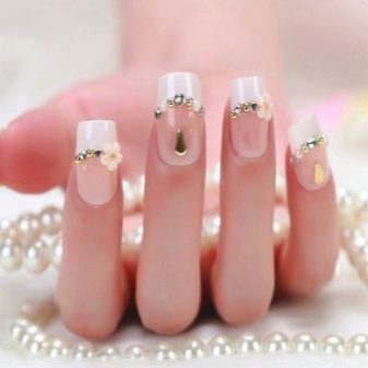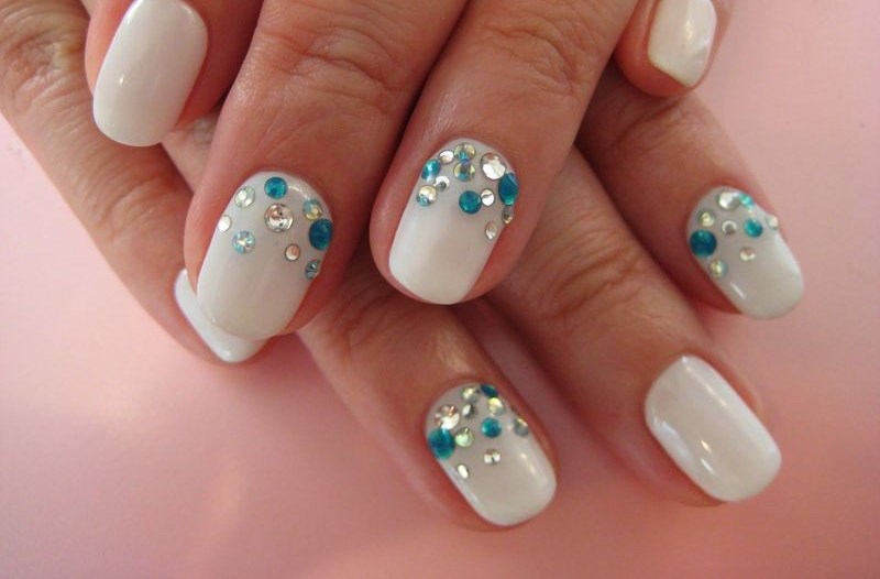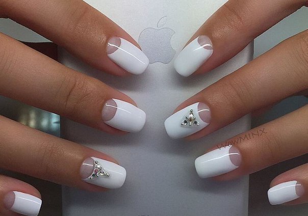 Sometimes at home you can attach a stone to a drop of base or topcoat. If you make a manicure with shellac or gel, then stick the stones at the last moment - after drying the finish and removing the sticky layer. White manicure with rhinestones is quite simple and concise. In the absence of experience can make stupid mistakes.