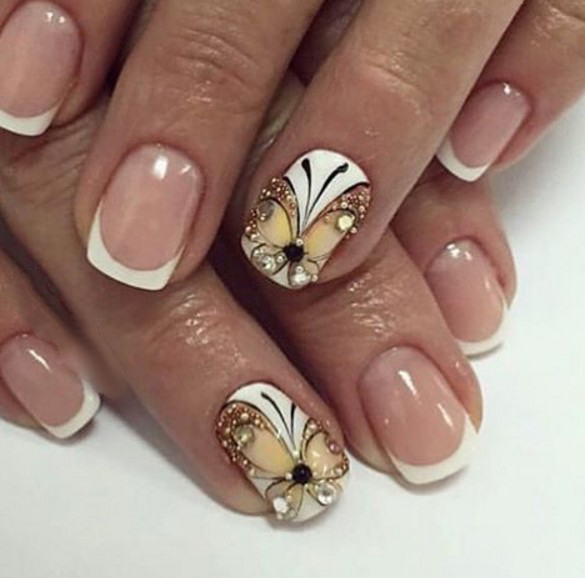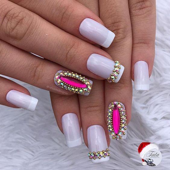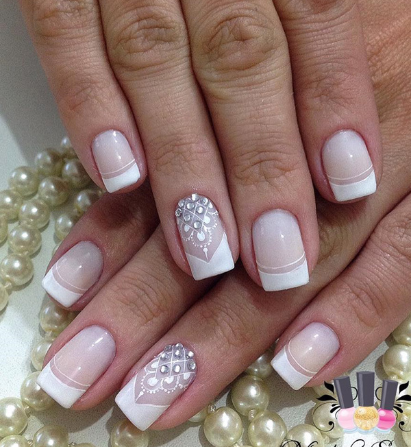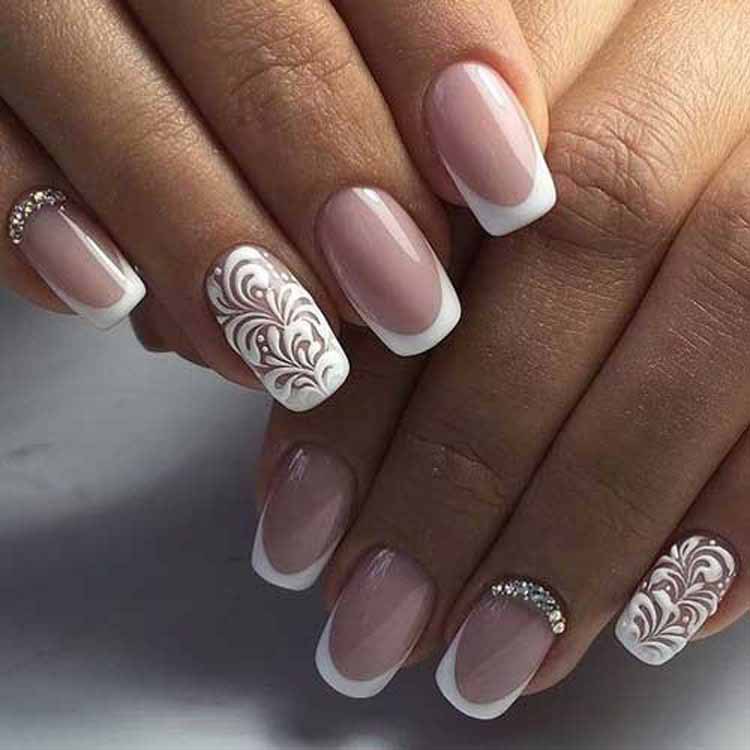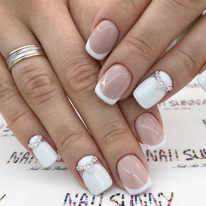 Refined white manicure with stones shines in daylight and uplifting. Classic designs look appropriate at a wedding, a celebration, or on a date. The color of the stones should be chosen so that they are consistent with your image. French manicure has been popular for many years. This nail design is not outdated and always remains in trend. Classic French white color is combined with rhinestones of any color. Looks great combination of monograms with this design.