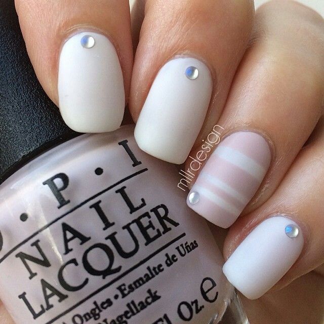 Choosing a finish coating can change the look of any design. Velvet matte manicure looks restrained, does not rush into your eyes. This coating can be applied only on a perfectly flat nail, otherwise it will emphasize the disadvantages. Equally good white matte manicure looks on long and short nails. With this finish, you can use a lot of sparkles that will look inconspicuous.