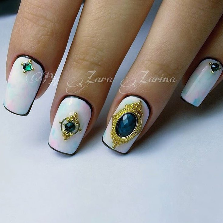 Modern ideas are not limited to just drawings of stones on a white background. Rhinestones that imitate rubies, diamonds, emeralds are very popular. You can randomly scatter them on the nails or decorate one nail. Glittery jewelry can be used with special beads for nail decoration.
