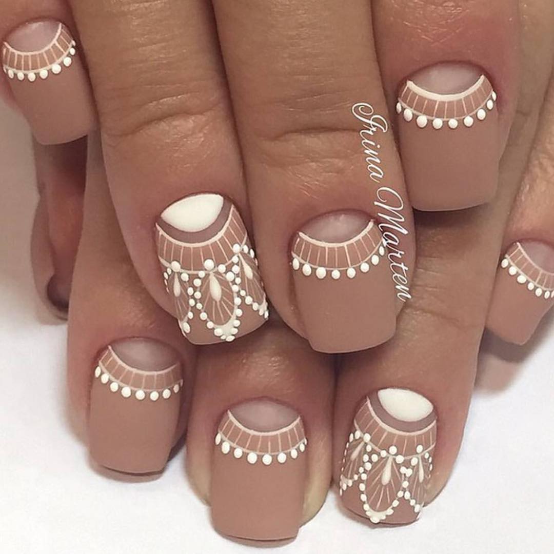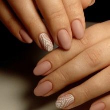 - Lacy nail decoration in a warm beige color.
