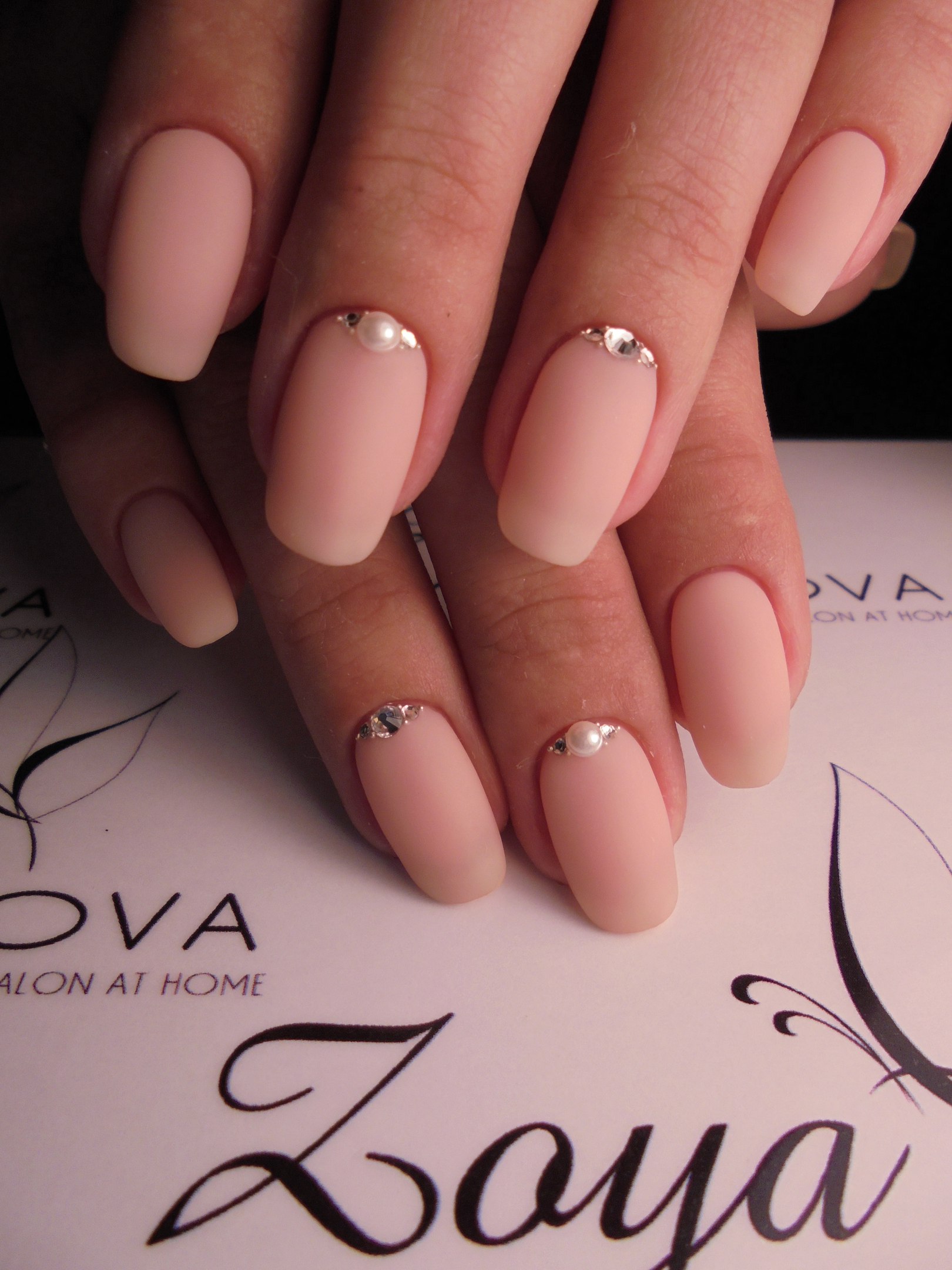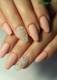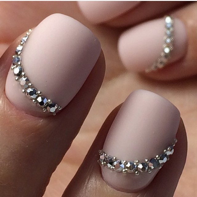- Matte manicure with rhinestones and stylish accent finger decor.