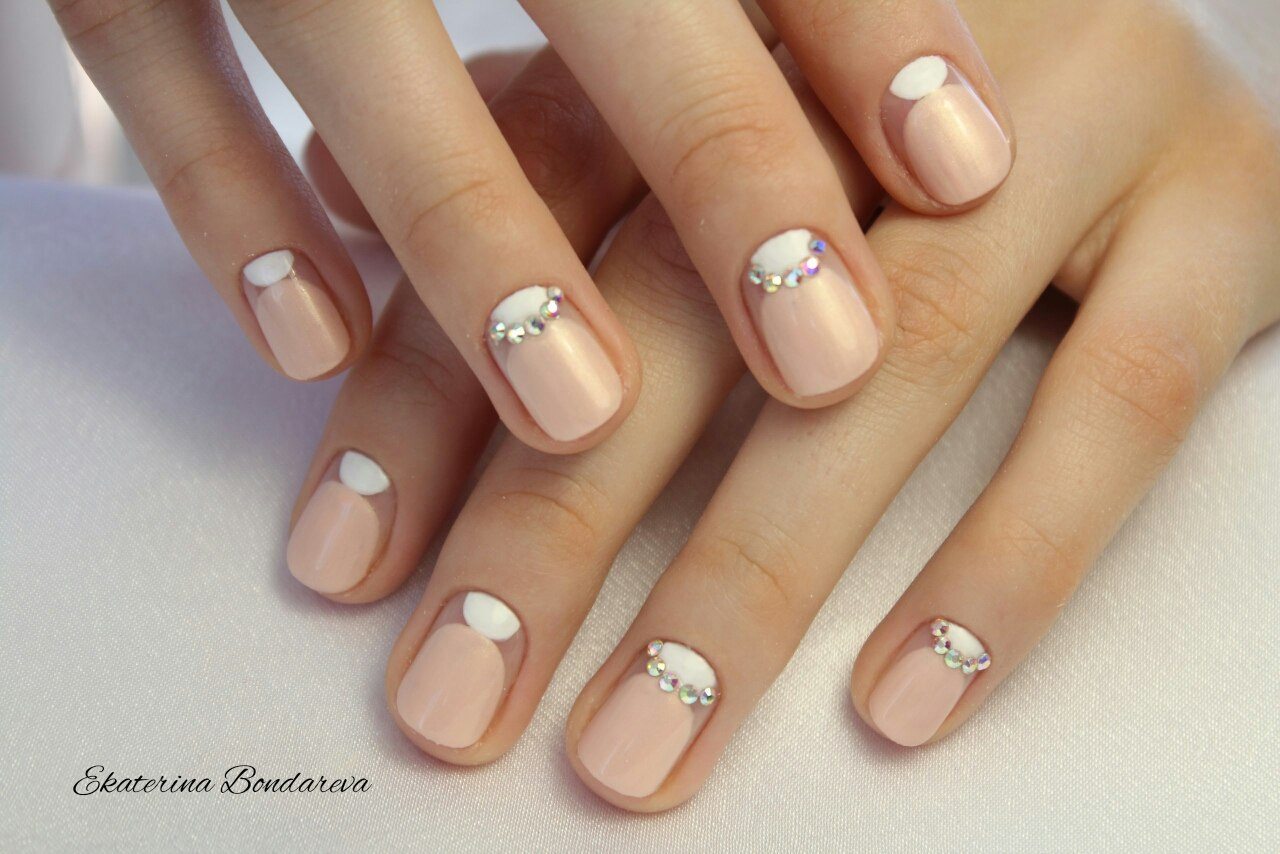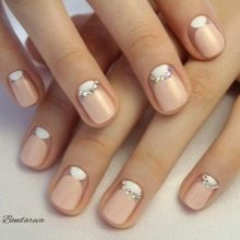 In addition, geometric designs are popular. For example, it may be white zigzag stripes on a beige background, vertical straight along the center of the nail plates with the image on them of dots of different sizes.