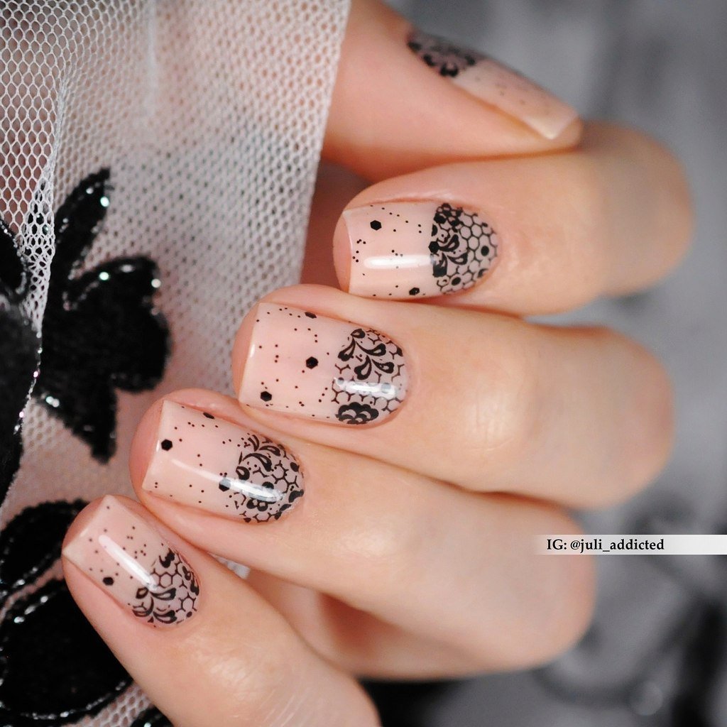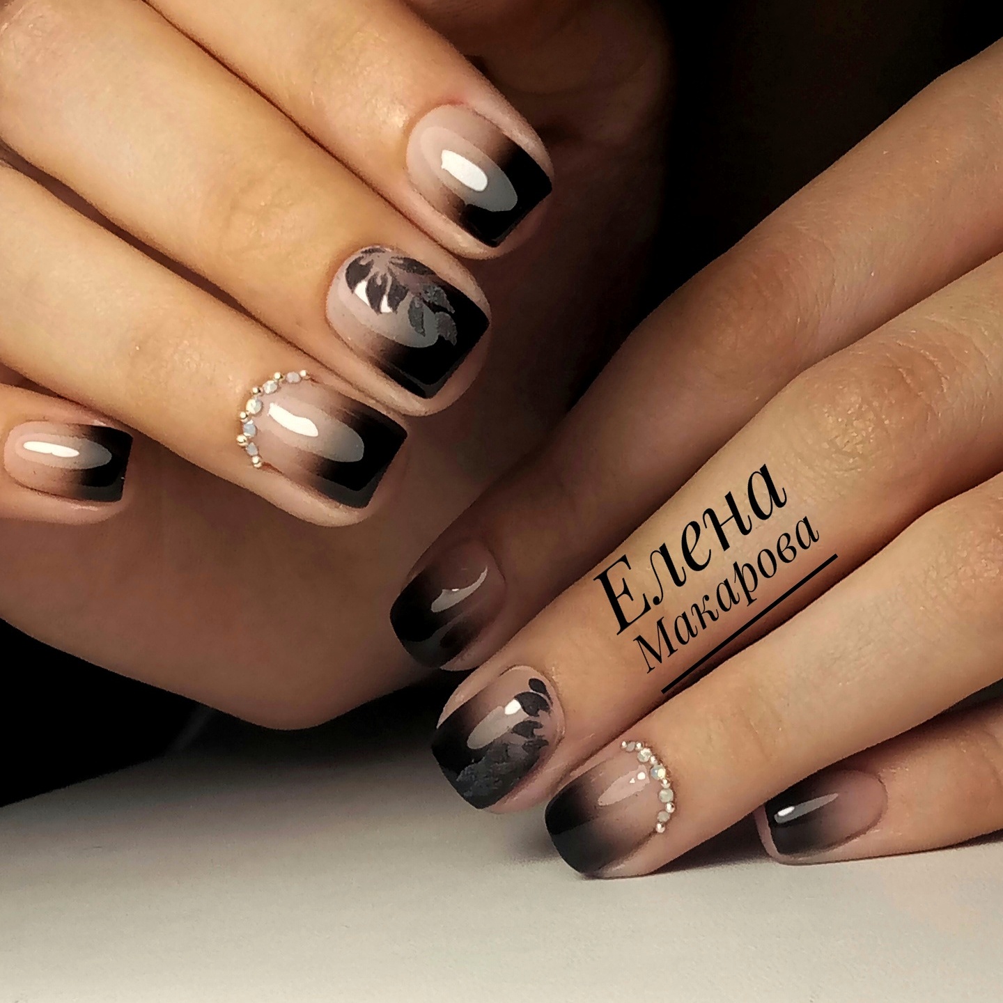 Decorate with images as a manicure in the method of "gradient". In order not to deprive the coating of a pleasant overflow of shades, the drawing is selected small, drawing it more often with one color. To highlight any elements of the pattern using small rhinestones of the desired color. For example, for white flowers they are transparent, for a lace pattern in black colors can be not only white, but also black. On stylized branches, the color of rhinestones is often chosen to match the material used for drawing.