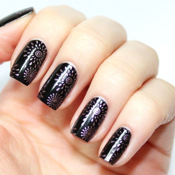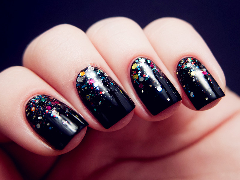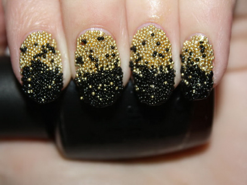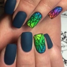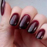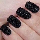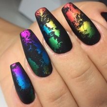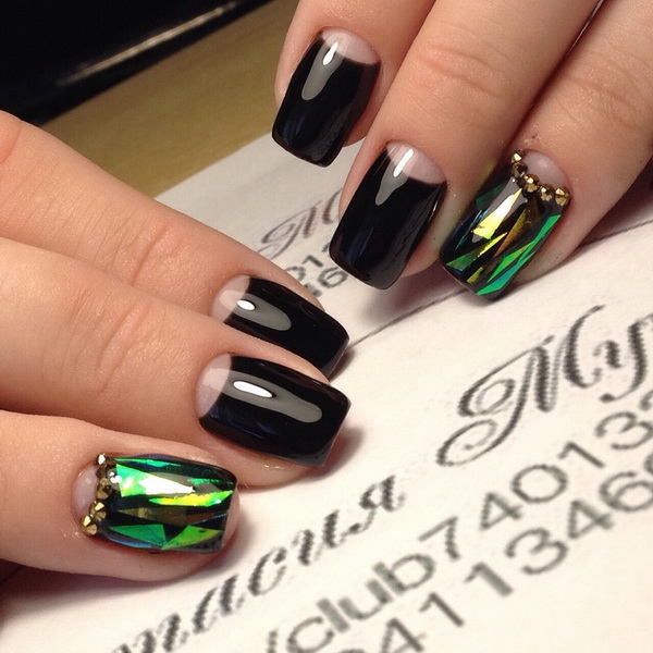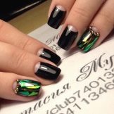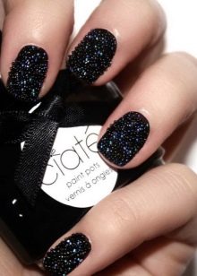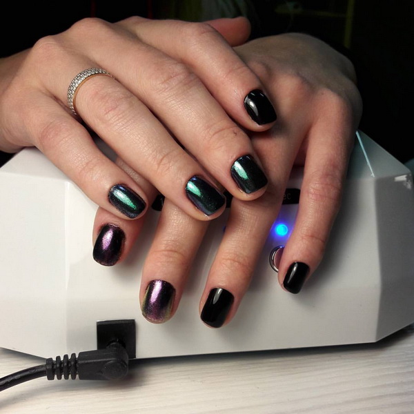 Another technique that allows you to make a manicure original. Rubbing is a colored and very fine polyester powder, which is rubbed into an already applied lacquer. As a result, the coating becomes absolutely smooth, almost mirror-like, and takes on a fancy color. Black base will balance the color gamut. It is very important that the powder is applied on a flat surface and distributed evenly. Skilled masters advise from above to cover a nail with a glossy transparent top. In addition to the powder, it can be done with sequins. On the basis of black lacquer colors will be deeper.