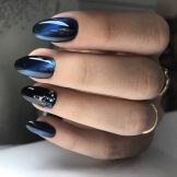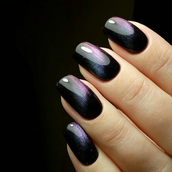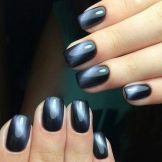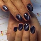 In nature, there is a mineral called "cat's eye." It is characterized by unusual futuristic coloring. Manicure with a similar name is intended to repeat it. The special component of the varnish is metallic dust, which adds shine and creates a texture similar to a precious stone during processing. For impact use a magnet. The cat's-eye technique looks spectacular on black lacquer, as metallic magnetic divorces create cosmic drawings.