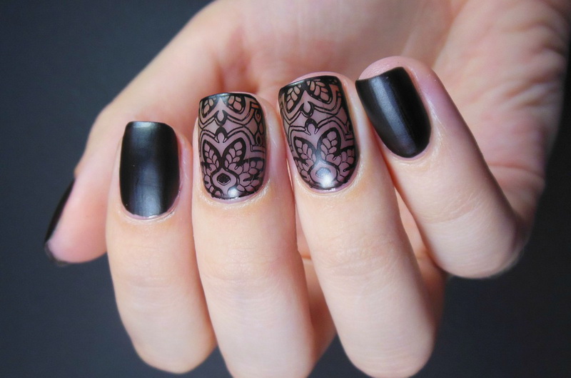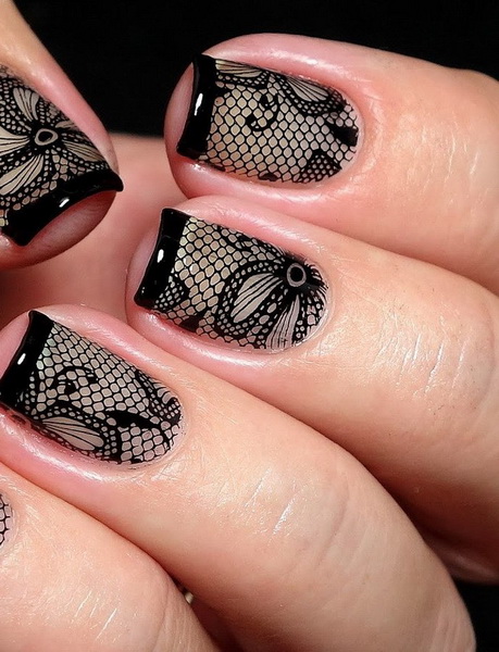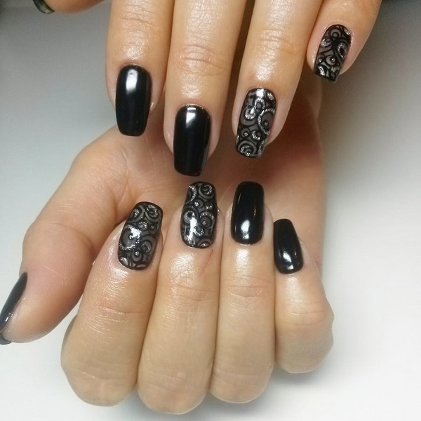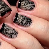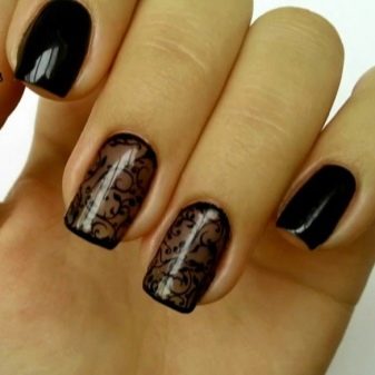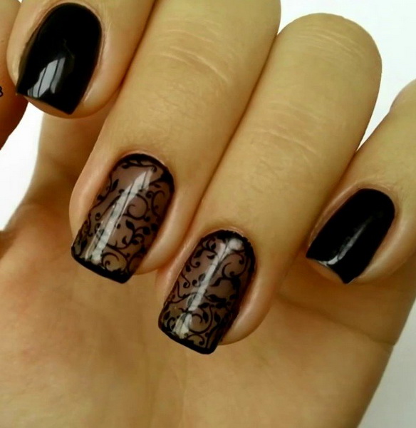 Rich, but at the same time elegant manicure, made in the technique of "veil". Patterns are made in different ways and materials. The design with black sand lace, decorated with individual drops or colored rhinestones looks spectacular. Metallic shades on a black background are popular at all times. The most common options with a cross, rays, spirals and more complex geometry. It is suitable for creating futuristic trendy images.