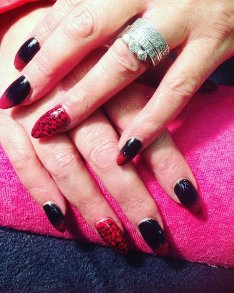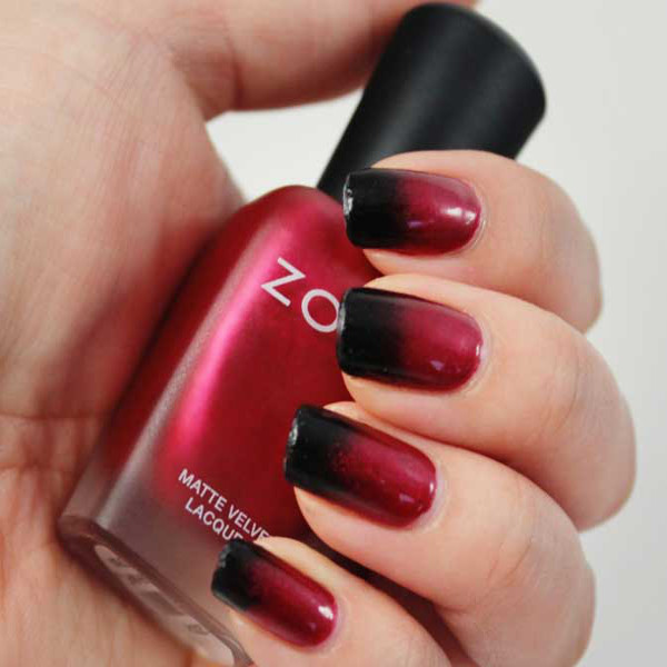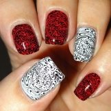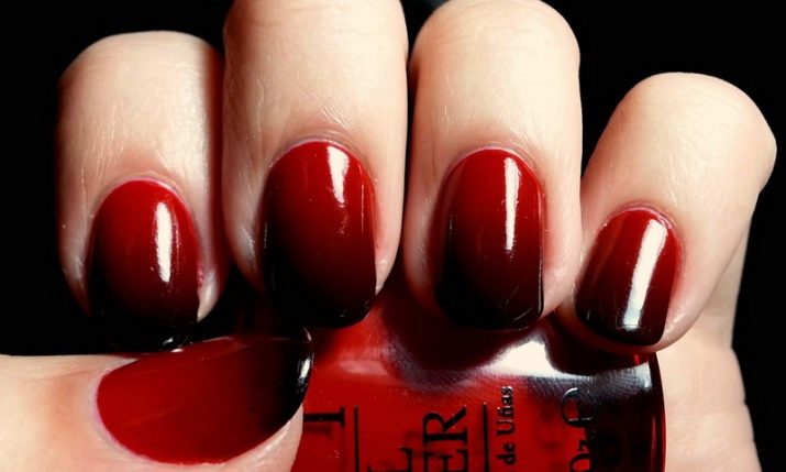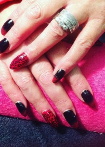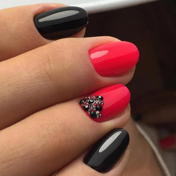 Original coloring in peas. Moreover, the size of the peas can vary, flowing from large to small. Popular "chessboard", as well as the famous "veil". Elegant and bright looks on the hands of a black and red manicure. Original transitions in the ombre technique will definitely attract the attention of others. The black basecoat is combined not only with a richly scarlet or elegantly burgundy color, but also coral, crimson, ruby, fuchsia and a shade of mahogany.