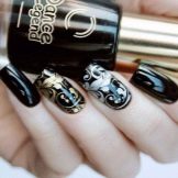 At the ceremonial events, the ladies want to look stunning, so the manicure is chosen bright, festive, with beautiful decorative elements. Variations on a black background are rich and chic. The elegance can be given a monochromatic black lacquer, adorned with beads, rhinestones, various sparkles. Their brilliance in the light of spotlights will attract attention to its owner.