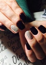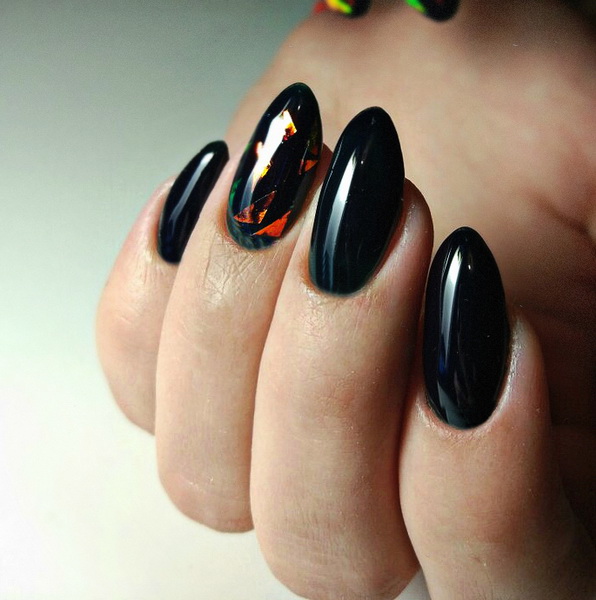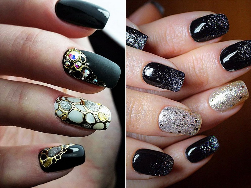 Impressive combinations are obtained by combining black and gold. A few nails with a brilliant pattern will transform the manicure, making it royally beautiful and rich. To enhance the aristocratic effect, stylists propose using matte black lacquer to use gold sand patterns or create gilded “black caviar” on it using fine beads.In a festive bright manicure looks like with “broken glass” on a dark base coat. For him use a holographic film of different colors. It can be silver, gold, multi-color. From the "fragments" create a composition or cover only part of the nail plate, for example, the hole.