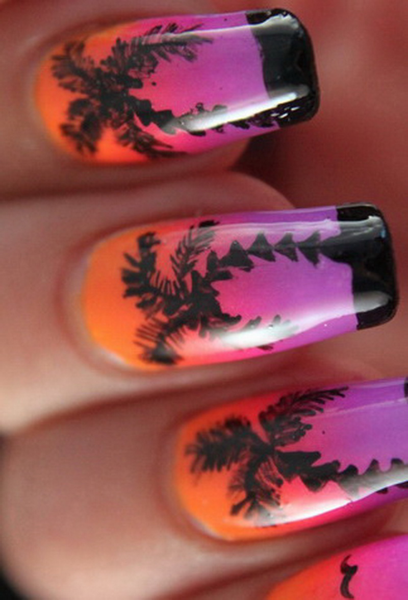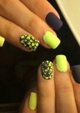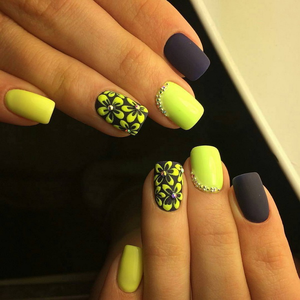 Black color can be diluted with bright summer colors, reproduce the corresponding pictures and get a great holiday manicure. Stylists love combining with yellow for summer looks, as it is associated with sunlight. With it, you can draw sunflowers on a black background or bright sunspots. Summer manicure involves the use of black lacquer in order to shade the brightness and saturation of the selected colors: green, light green, turquoise, fuchsia, orange. He is no longer playing a leading role here.