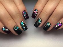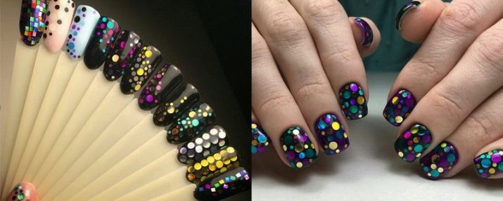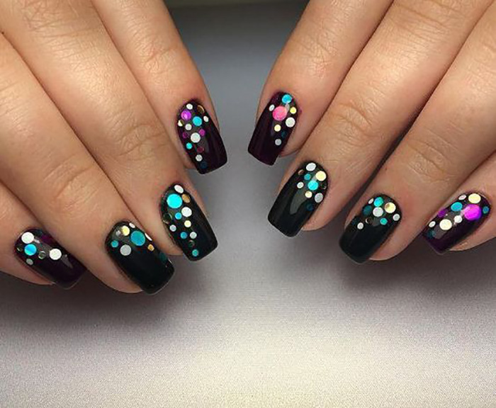 Kamifubuki - very original design, which came from Japan. This is a manicure with stickers that is performed on a coal black base. Kamifubuki are multi-colored round confetti of different sizes. They are glued to the background and covered on top with a transparent top. The result is stunning, the manicure is festive and bright.