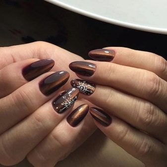 Brown, like black, is a basic shade, so they are perfectly combined with each other. On the glossy chocolate-pearl surface, the pictures are black velvet sand. If they are also decorated with rhinestones, then the result will be appropriate not only for the office, but also for a divine dinner. Black-brown modulations in the cat-eye technique make the nail look like the unique natural shades of this mineral.