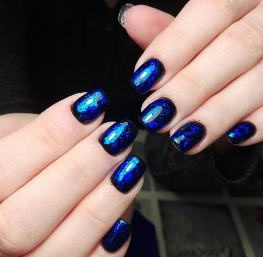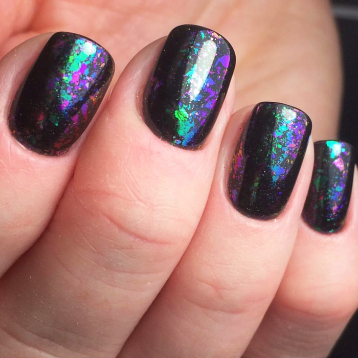 A fundamental element of the technology is a holographic foil. It is cut into individual pieces in the form of glass fragments. On a black background, they look particularly impressive. The location of the pieces on the surface of the nail plate depends entirely on the imagination of the master. It can be vertical, horizontal, chaotic, only at the edges or near the hole.