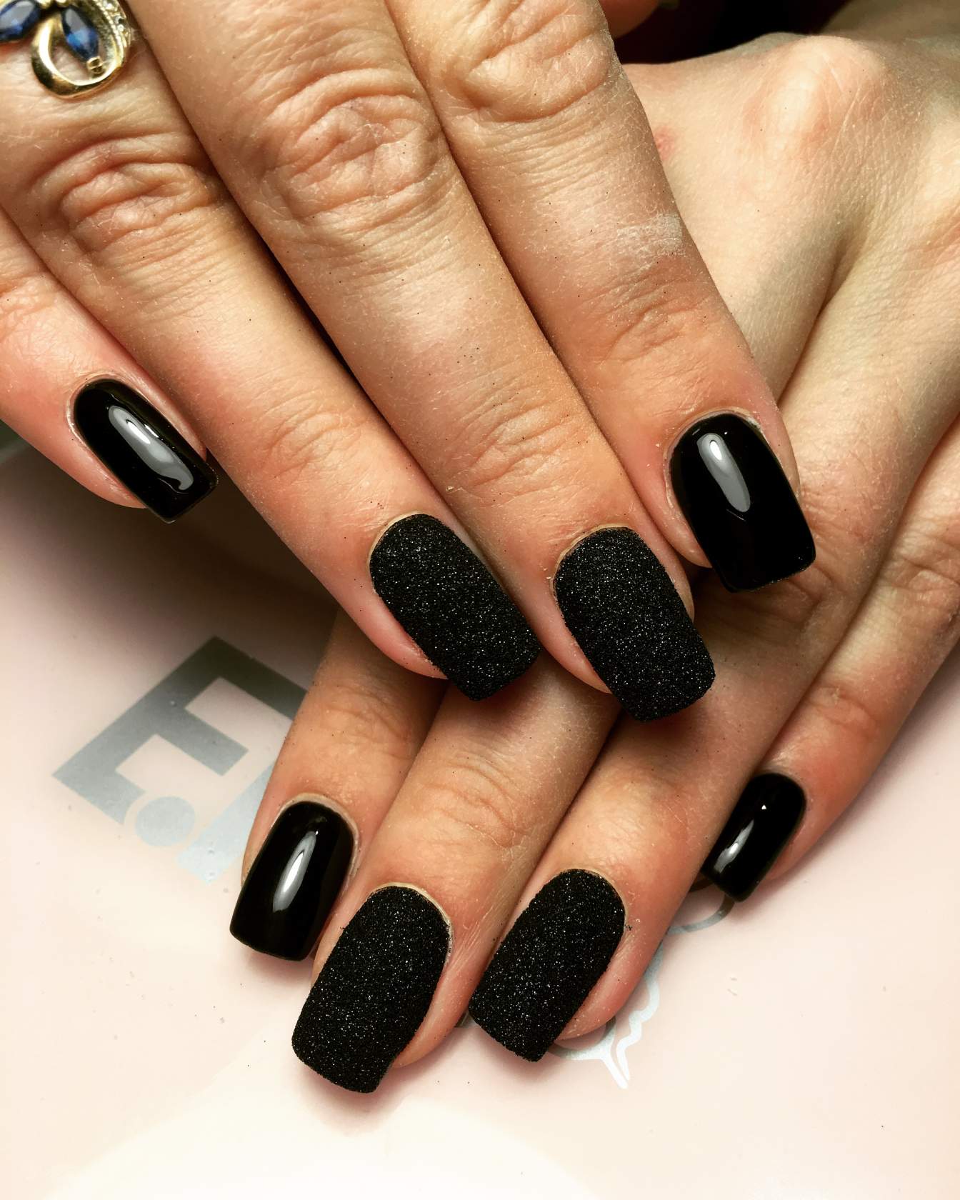 Textured variations are obtained by blending several styles and textures. For example, glossy and matte areas look original on one nail plate. However, they can be of different shades or the same color. One of the variants of such a technique is the image of monograms or other patterns made with gloss on a matte black surface. Also this category includes sand graphics, stained glass.