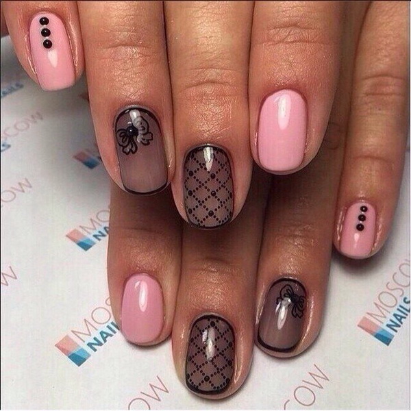 Natural style begins a new life in the modern world. Bright contrasts are sometimes inferior to natural shades: cream, peach and flesh. Powder colors are popular in manicure as a supplement to black. They muffle it a little, making it more restrained. Romantic style can be created by combining pink with black. And the brighter the shade, the festive look manicure. Black thin laces made with a thin brush look great on a beige background. The base coating can be made in a matte version, and the pattern in a glossy.