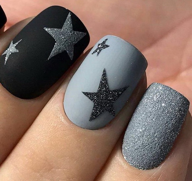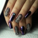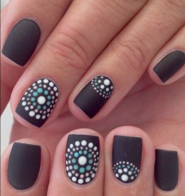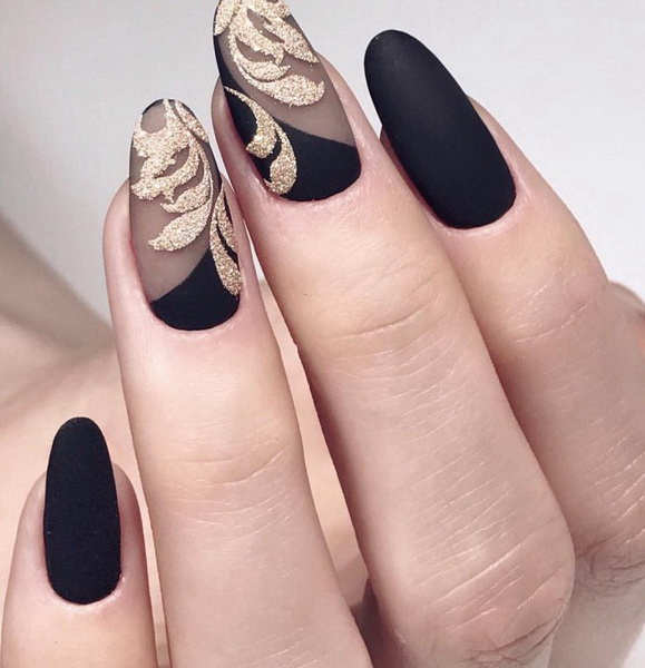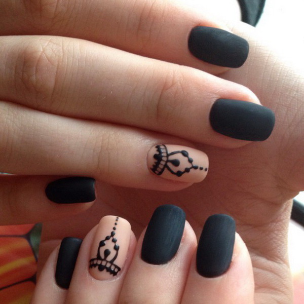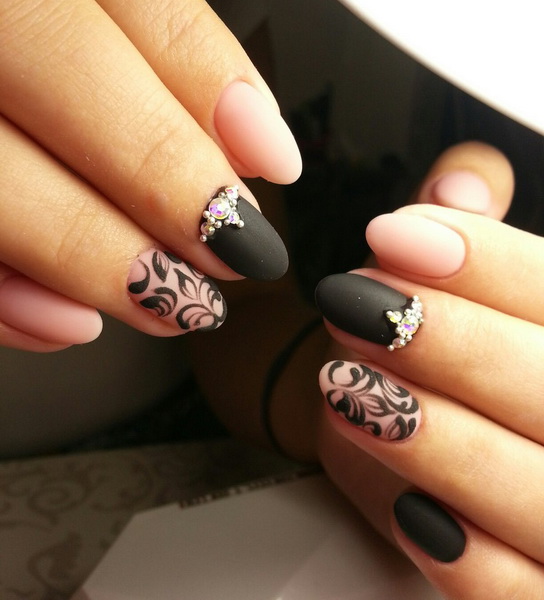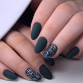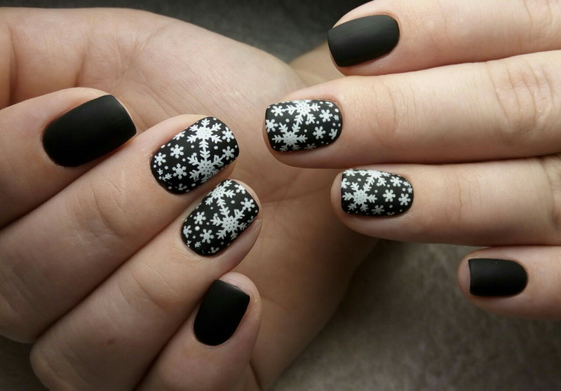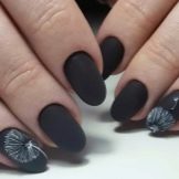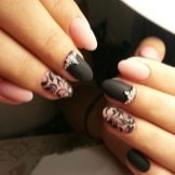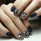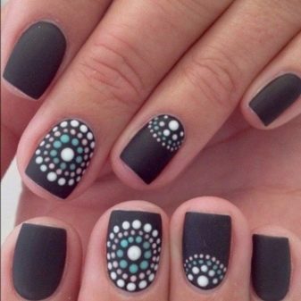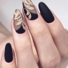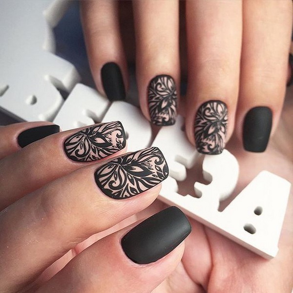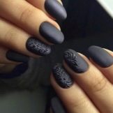 One of the best options for drawing on a black matte basis can be called a monogram. Various lace patterns, tricky interweaving will look exquisitely in the technique of "veil", as well as winter snow-covered design. In addition to lace and various mesh, fashionable patterns of ethnic orientation, prints of golden or white dream catchers, dandelions, stylized animals. Geometry has a special place in design; today such drawings are considered to be trendy.