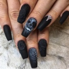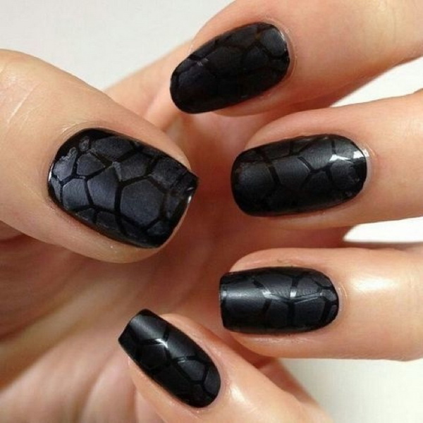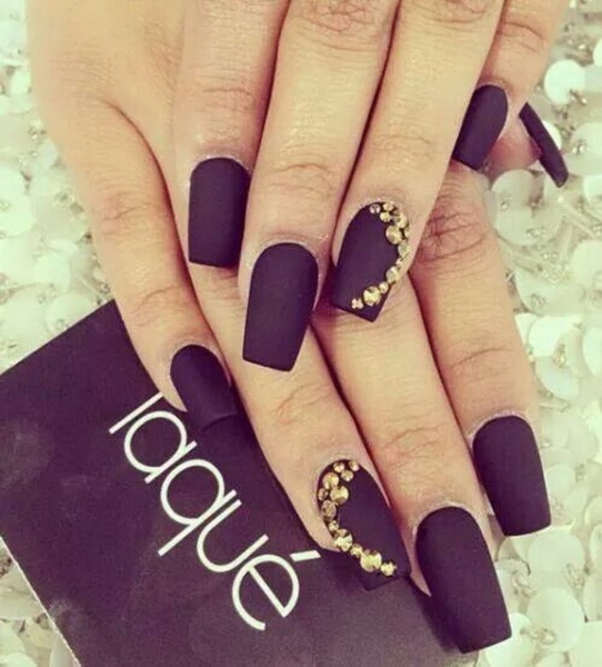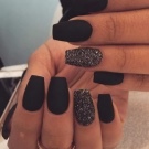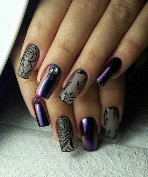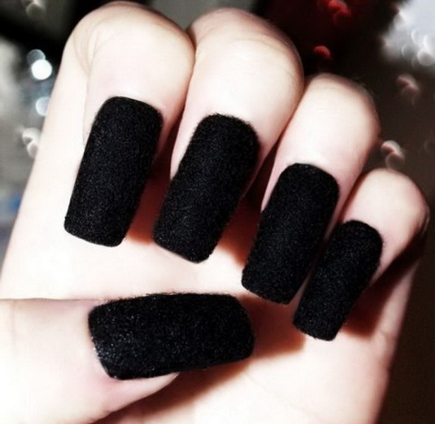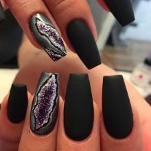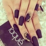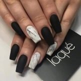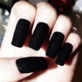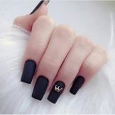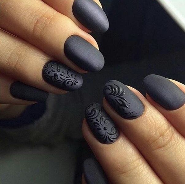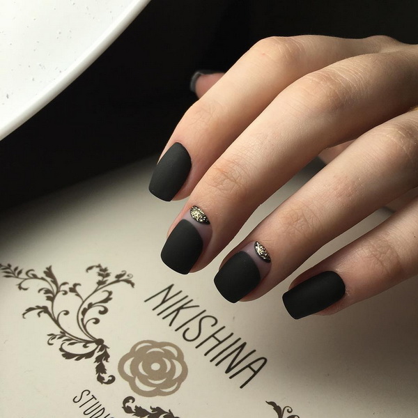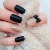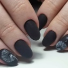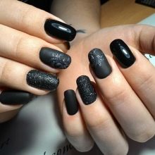 Black matte manicure has several features. For example, the varnish may have a different texture, which may not be combined with the planned decoration of accent nails. It can be satin, velor, velvety or suede. Each type of lacquer has its own characteristics and even looks outwardly differently.