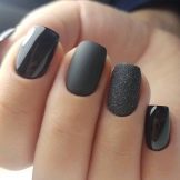 Classic manicure in black with a matte texture gel polish looks incredibly impressive. Often the coatings themselves are so beautiful that the use of further decor becomes inappropriate. If you decorate such a coating, it is only a monotonous contrast of the accent, which will unobtrusively emphasize the status of the lacquer product used. For example, you can sprinkle one of the nails with acrylic powder, which is now considered one of the trendy ways to decorate a design.