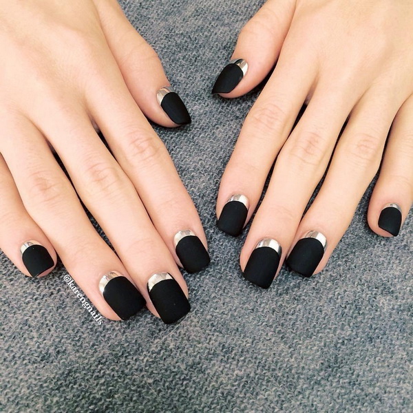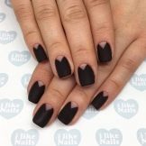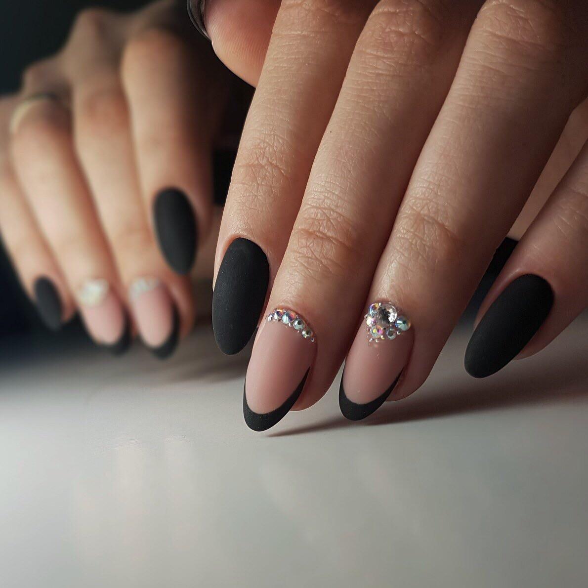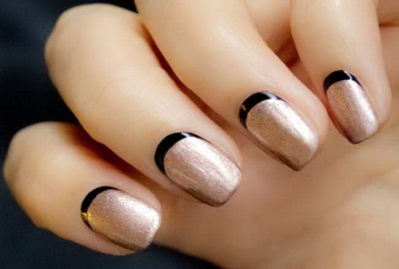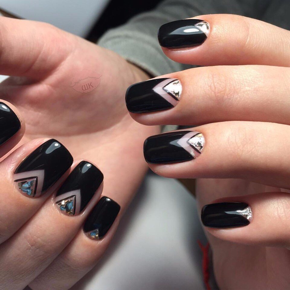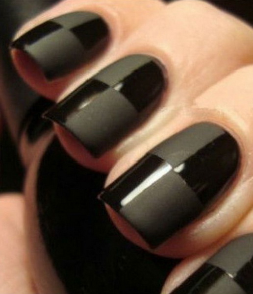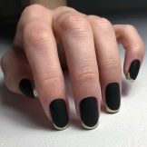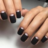 Inverted jacket in black can be called one of the best design options to date. It is made popular by the fashionable method of highlighting the cuticle zone, which today gives out not only a beautiful manicure, but also nail design taking into account fashion trends. It is fashionable not only to encircle the lower part of the nail plate, but also to designate it with a glittering decor, as well as with a special manicure foil.