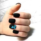 Pay attention to the color of the pattern and the tone of the accent nail. For example, a stamping butterfly made in a turquoise tone, rather than its drawing on a nail of turquoise color, will look more harmonious in design. If in the first case the print can be supplemented with a glitter coating, the second design is doomed to a fashionable failure: the turquoise nail among the other black ones will look too sharp.Consider the manner of print - stylization on a black background looks better.