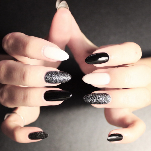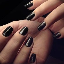Glitter and black manicure is one of the trends of the new season. Despite the fact that fashion today seeks to minimalism and ease of design, it allows for the appropriate placement and bright decor. Let us turn to illustrative examples.